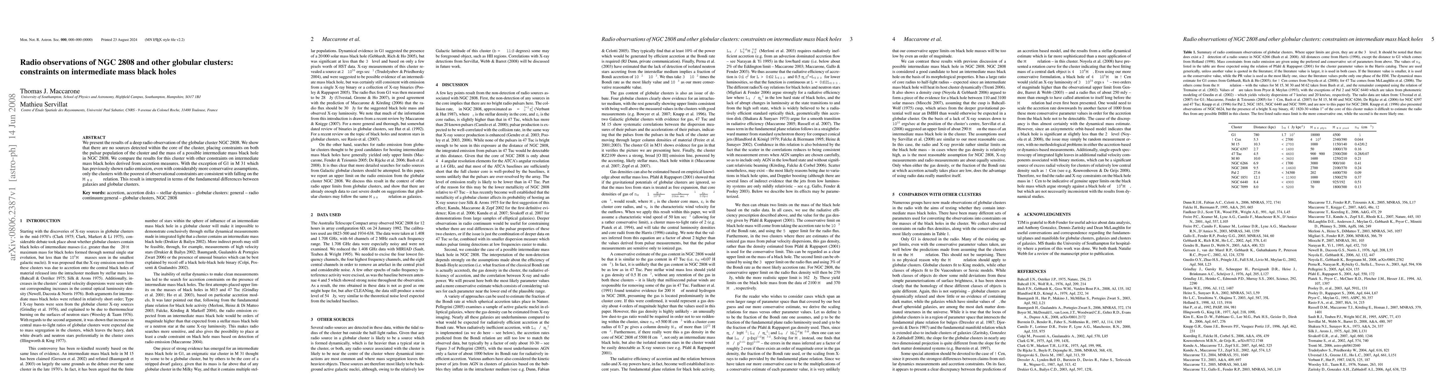This paper reports deep radio observations of the globular cluster NGC 2808, finding no detected sources within its core, which constrains the cluster's pulsar population and the potential mass of an intermediate mass black hole. The findings suggest that most globular clusters do not align with the $M_{BH}-\sigma$ relation, indicating fundamental differences between galaxies and globular clusters.