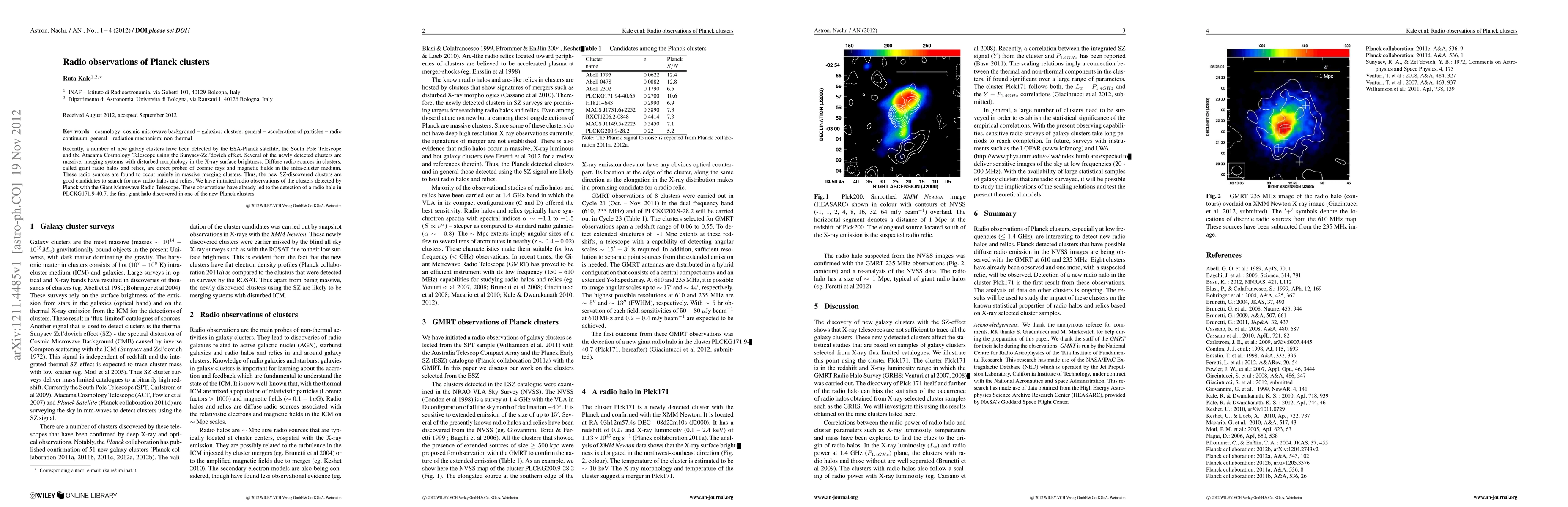 Recently, a number of new galaxy clusters have been detected by the ESA-Planck satellite, the South Pole Telescope and the Atacama Cosmology Telescope using the Sunyaev-Zeldovich effect. Several of the newly detected clusters are massive, merging systems with disturbed morphology in the X-ray surface brightness. Diffuse radio sources in clusters, called giant radio halos and relics, are direct probes of cosmic rays and magnetic fields in the intra-cluster medium. These radio sources are found to occur mainly in massive merging clusters. Thus, the new SZ-discovered clusters are good candidates to search for new radio halos and relics. We have initiated radio observations of the clusters detected by Planck with the Giant Metrewave Radio Telescope. These observations have already led to the detection of a radio halo in PLCKG171.9-40.7, the first giant halo discovered in one of the new Planck clusters.