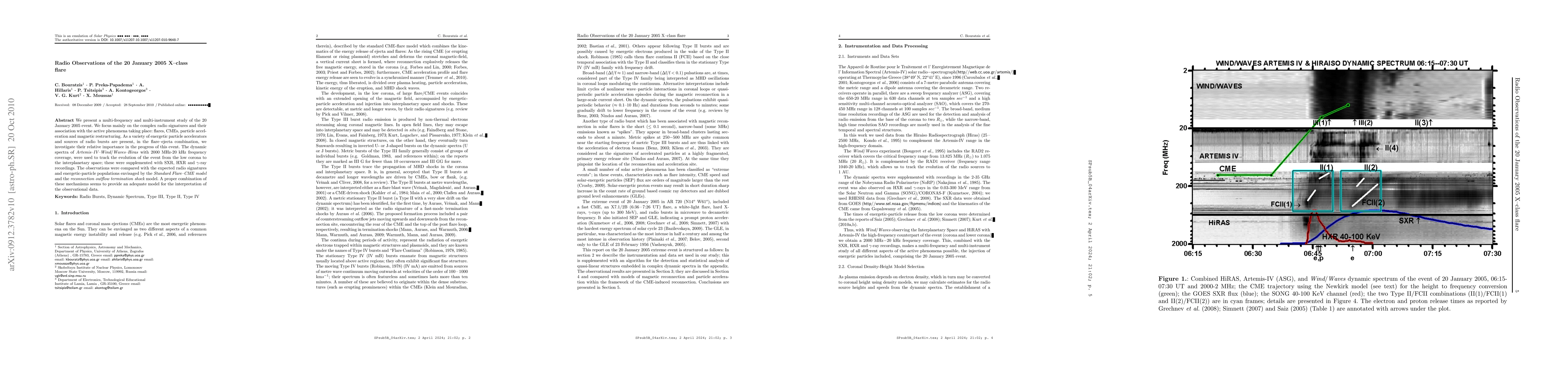 We present a multi-frequency and multi-instrument study of the 20 January 2005 event. We focus mainly on the complex radio signatures and their association with the active phenomena taking place: flares, CMEs, particle acceleration and magnetic restructuring. As a variety of energetic particle accelerators and sources of radio bursts are present, in the flare-ejecta combination, we investigate their relative importance in the progress of this event. The dynamic spectra of {Artemis-IV-Wind/Waves-Hiras with 2000 MHz-20 kHz frequency coverage, were used to track the evolution of the event from the low corona to the interplanetary space; these were supplemented with SXR, HXR and gamma-ray recordings. The observations were compared with the expected radio signatures and energetic-particle populations envisaged by the {Standard Flare--CME model and the reconnection outflow termination shock model. A proper combination of these mechanisms seems to provide an adequate model for the interpretation of the observational data.