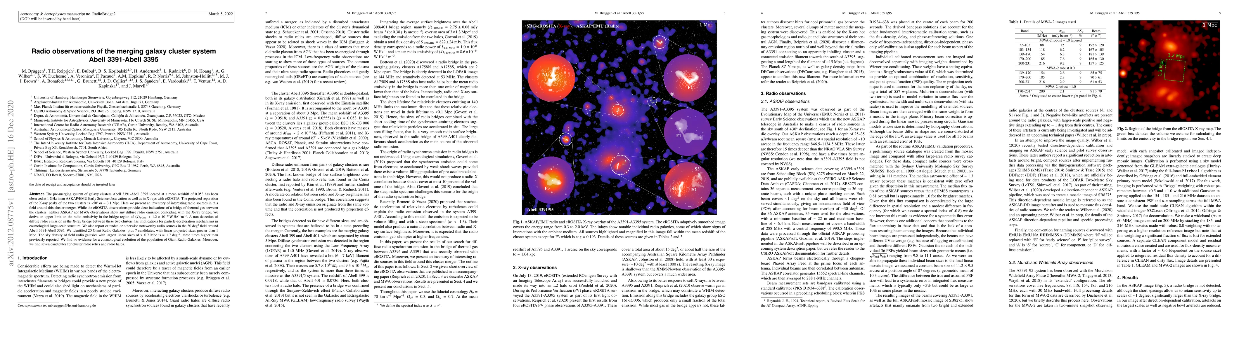 The pre-merging system of galaxy clusters Abell 3391-Abell 3395 located at a mean redshift of 0.053 has been observed at 1 GHz in an ASKAP/EMU Early Science observation as well as in X-rays with eROSITA. The projected separation of the X-ray peaks of the two clusters is $\sim$50$'$ or $\sim$ 3.1 Mpc. Here we present an inventory of interesting radio sources in this field around this cluster merger. While the eROSITA observations provide clear indications of a bridge of thermal gas between the clusters, neither ASKAP nor MWA observations show any diffuse radio emission coinciding with the X-ray bridge. We derive an upper limit on the radio emissivity in the bridge region of $\langle J \rangle_{1\,{\rm GHz}}< 1.2 \times 10^{-44} {\rm W}\, {\rm Hz}^{-1} {\rm m}^{-3}$. A non-detection of diffuse radio emission in the X-ray bridge between these two clusters has implications for particle-acceleration mechanisms in cosmological large-scale structure. We also report extended or otherwise noteworthy radio sources in the 30 deg$^2$ field around Abell 3391-Abell 3395. We identified 20 Giant Radio Galaxies, plus 7 candidates, with linear projected sizes greater than 1 Mpc. The sky density of field radio galaxies with largest linear sizes of $>0.7$ Mpc is $\approx 1.7$ deg$^{-2}$, three times higher than previously reported. We find no evidence for a cosmological evolution of the population of Giant Radio Galaxies. Moreover, we find seven candidates for cluster radio relics and radio halos.