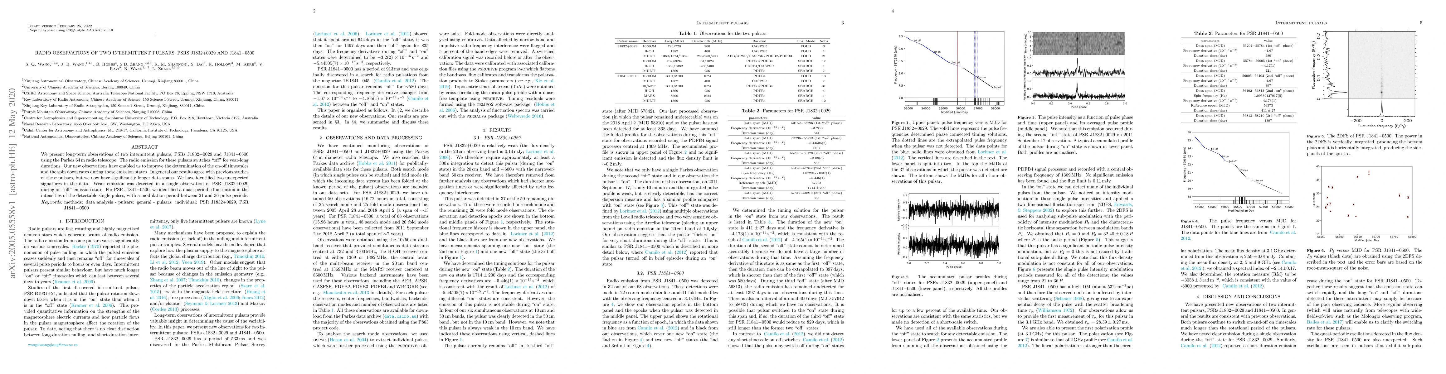 We present long-term observations of two intermittent pulsars, PSRs~J1832+0029 and J1841$-$0500 using the Parkes 64\,m radio telescope. The radio emission for these pulsars switches "off" for year-long durations. Our new observations have enabled us to improve the determination of the on-off timescales and the spin down rates during those emission states. In general our results agree with previous studies of these pulsars, but we now have significantly longer data spans. We have identified two unexpected signatures in the data. Weak emission was detected in a single observation of PSR~J1832$+$0029 during an "off" emission state. For PSR~J1841$-$0500, we identified a quasi-periodic fluctuation in the intensities of the detectable single pulses, with a modulation period between 21 and 36 pulse periods.