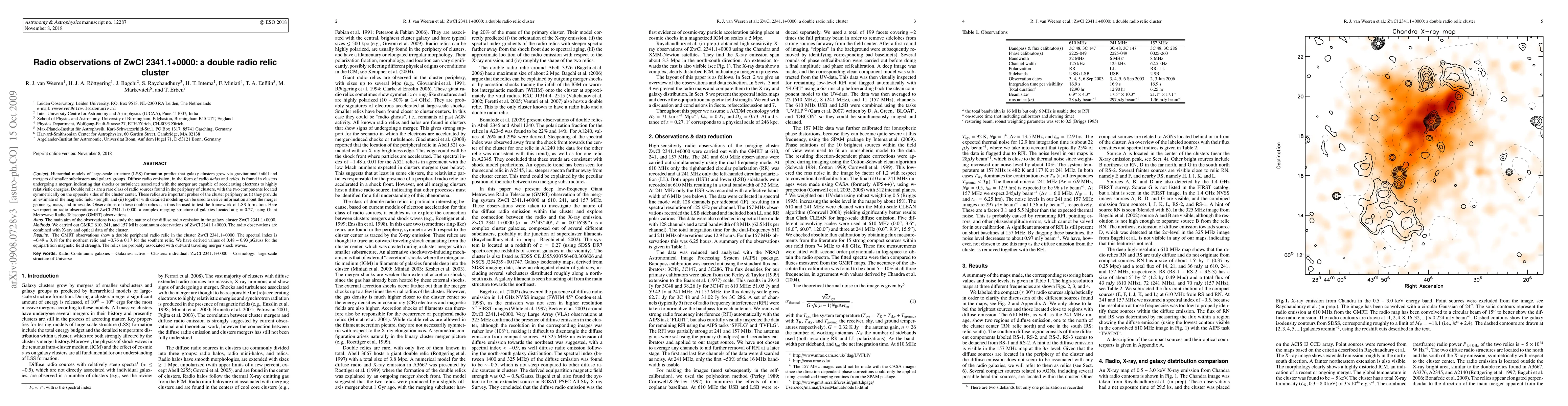 This paper reports on radio observations of the merging galaxy cluster ZwCl 2341.1+0000 using the GMRT, revealing a double peripheral radio relic indicative of merger-induced shock waves. The relics' spectral indices and magnetic field strengths suggest relativistic electron acceleration.