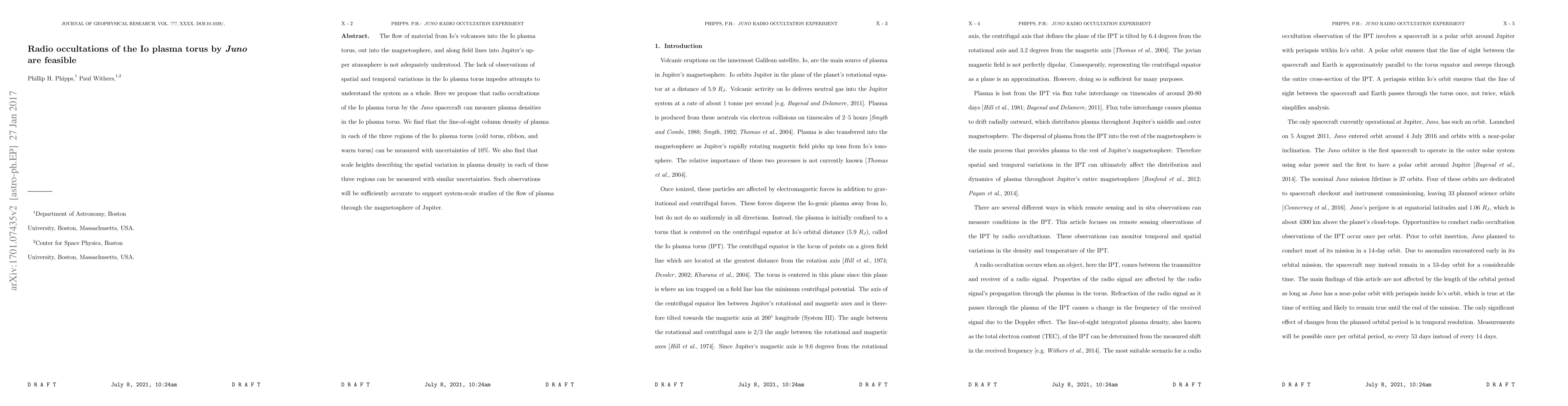 This paper proposes using Juno spacecraft radio occultations to measure plasma densities in the Io plasma torus, finding that uncertainties in the measurements are within 10%. These observations will provide accurate data to study the flow of plasma through Jupiter's magnetosphere.