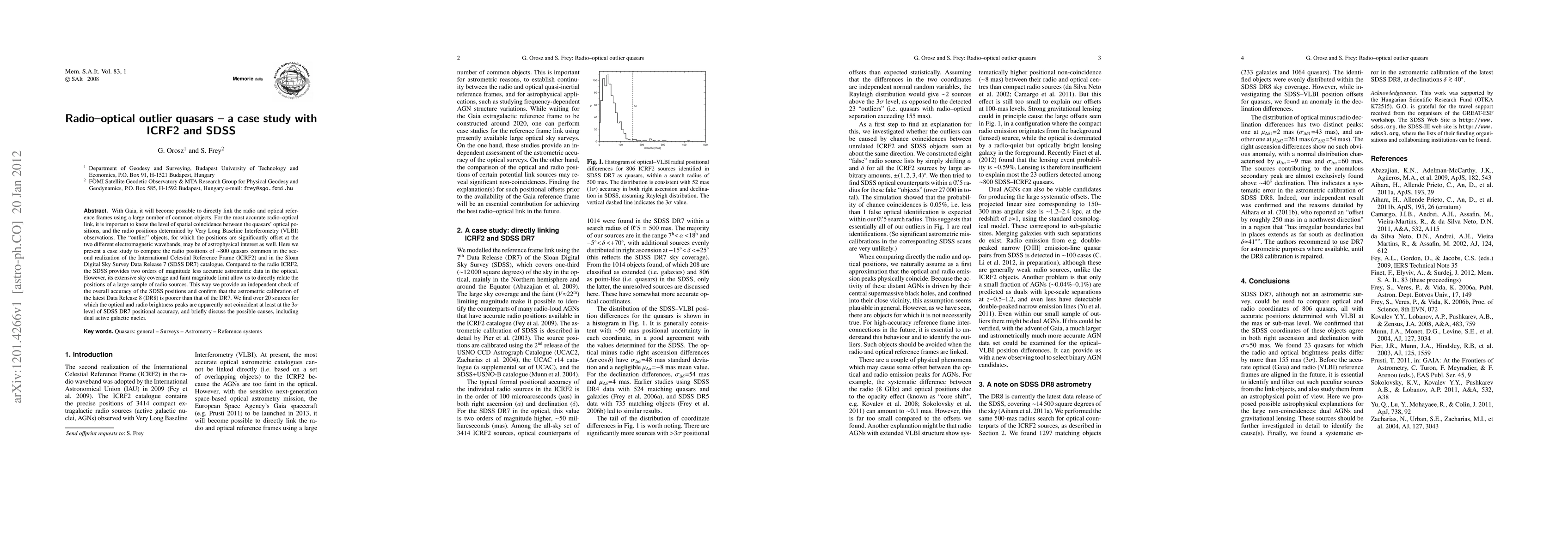 With Gaia, it will become possible to directly link the radio and optical reference frames using a large number of common objects. For the most accurate radio-optical link, it is important to know the level of spatial coincidence between the quasars' optical positions, and the radio positions determined by Very Long Baseline Interferometry (VLBI) observations. The "outlier" objects, for which the positions are significantly offset at the two different electromagnetic wavebands, may be of astrophysical interest as well. Here we present a case study to compare the radio positions of ~800 quasars common in the second realization of the International Celestial Reference Frame (ICRF2) and in the Sloan Digital Sky Survey Data Release 7 (SDSS DR7) catalogue. Compared to the radio ICRF2, the SDSS provides two orders of magnitude less accurate astrometric data in the optical. However, its extensive sky coverage and faint magnitude limit allow us to directly relate the positions of a large sample of radio sources. This way we provide an independent check of the overall accuracy of the SDSS positions and confirm that the astrometric calibration of the latest Data Release 8 (DR8) is poorer than that of the DR7. We find over 20 sources for which the optical and radio brightness peaks are apparently not coincident at least at the 3-sigma level of SDSS DR7 positional accuracy, and briefly discuss the possible causes, including dual active galactic nuclei.