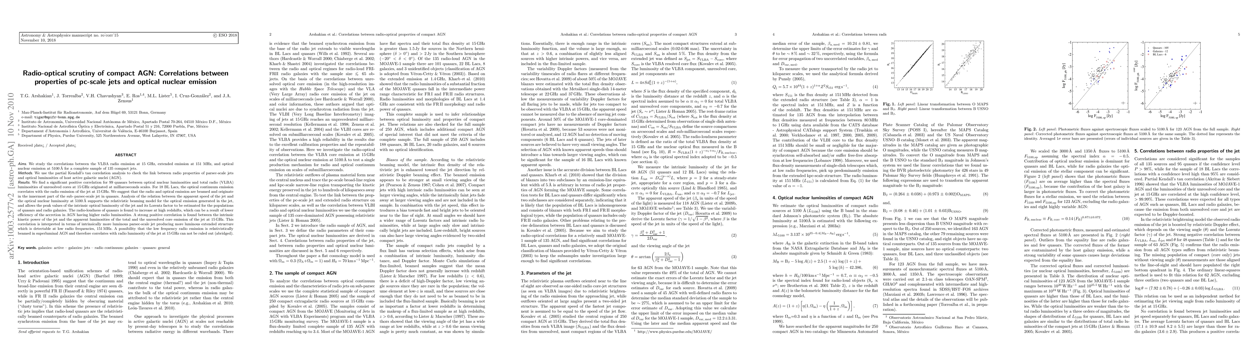 This study investigates correlations between radio and optical emissions in compact AGN jets, finding significant positive links between optical nuclear luminosities and radio luminosities at 15 GHz for quasars, and between optical and radio jet emissions for BL Lacs. The analysis suggests beamed emission from the innermost jet regions and supports relativistic beaming models for optical emission.