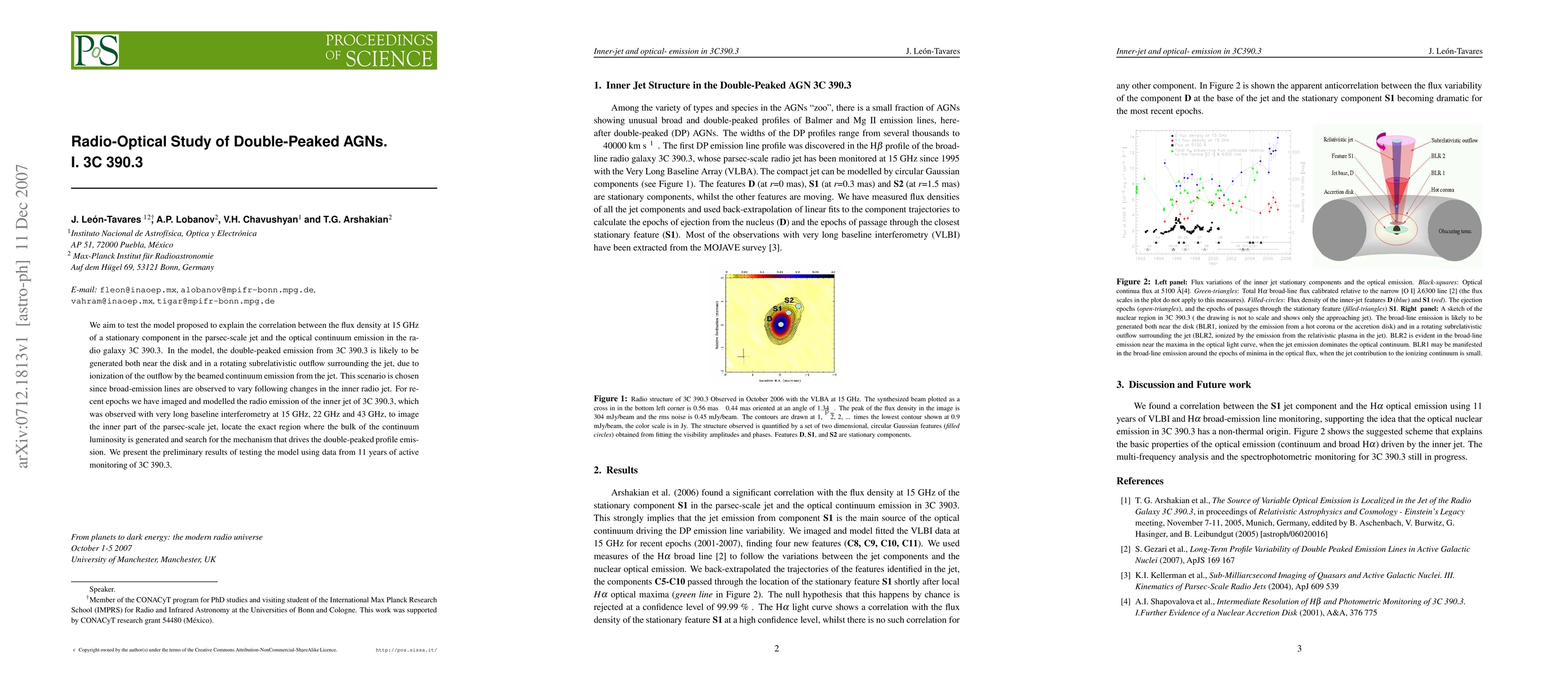 We aim to test the model proposed to explain the correlation between the flux density at 15 GHz of a stationary component in the parsec-scale jet and the optical continuum emission in the radio galaxy 3C~390.3. In the model, the double-peaked emission from 3C~390.3 is likely to be generated both near the disk and in a rotating subrelativistic outflow surrounding the jet, due to ionization of the outflow by the beamed continuum emission from the jet. This scenario is chosen since broad-emission lines are observed to vary following changes in the inner radio jet. For recent epochs we have imaged and modelled the radio emission of the inner jet of 3C~390.3, which was observed with very long baseline interferometry at 15 GHz, 22 GHz and 43 GHz, to image the inner part of the parsec-scale jet, locate the exact region where the bulk of the continuum luminosity is generated and search for the mechanism that drives the double-peaked profile emission. We present the preliminary results of testing the model using data from 11 years of active monitoring of 3C~390.3.