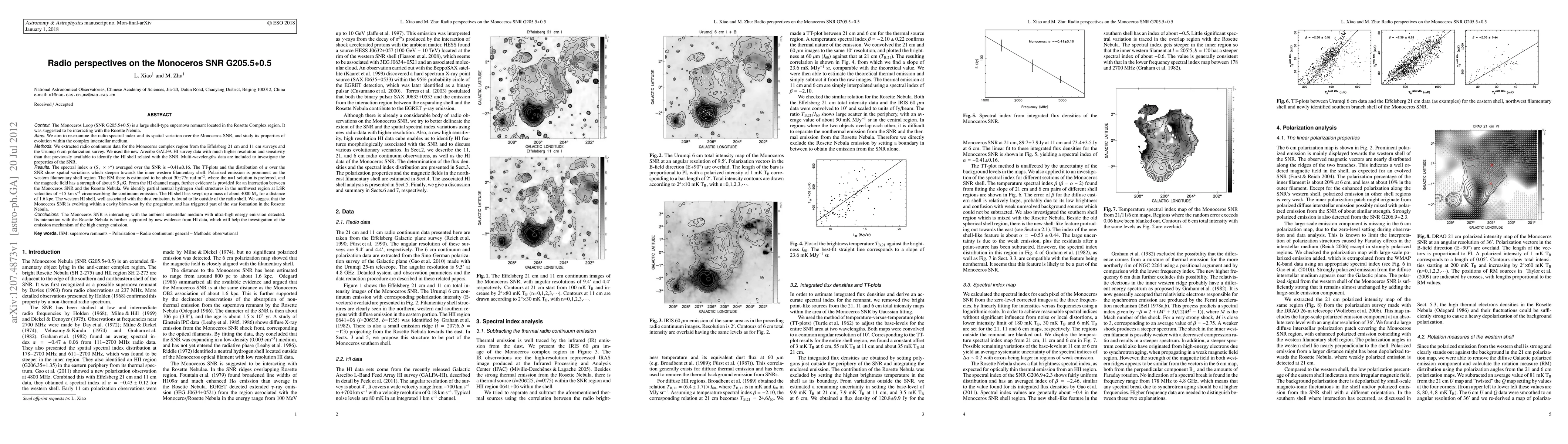 This paper re-examines the radio spectral index and spatial variations of the Monoceros SNR G205.5+0.5, revealing steepening towards the inner western filamentary shell and identifying a prominent polarized emission region. Evidence suggests interaction between the SNR and the Rosette Nebula, with a swept-up HI shell indicating triggered star formation.