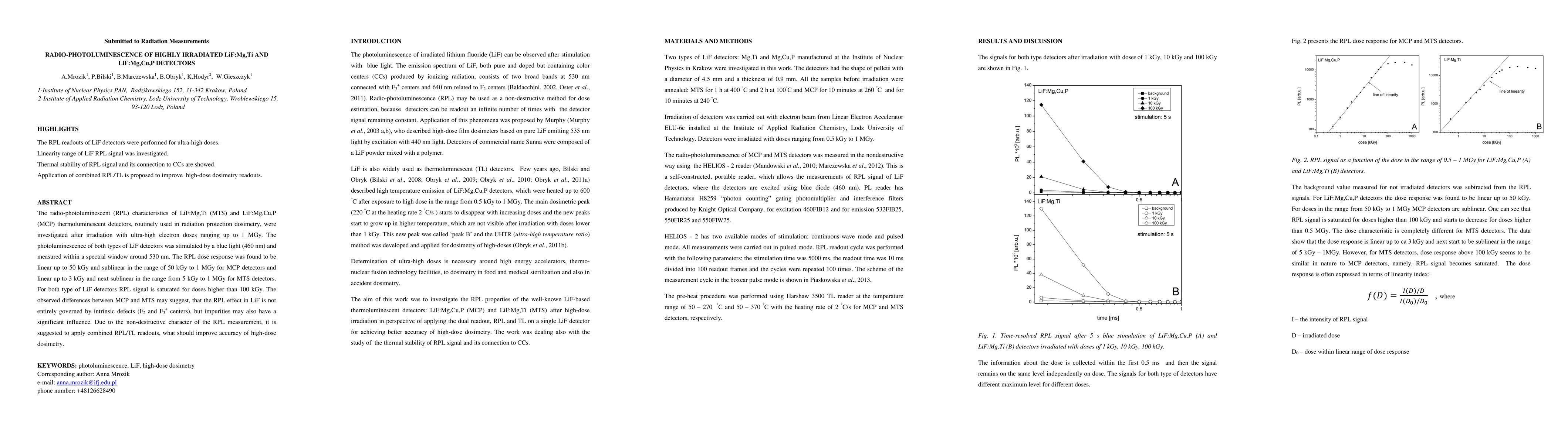 The radio-photoluminescent (RPL) characteristics of LiF:Mg,Ti (MTS) and LiF:Mg,Cu,P (MCP) thermoluminescent detectors, routinely used in radiation protection dosimetry, were investigated after irradiation with ultra-high electron doses ranging up to 1 MGy. The photoluminescence of both types of LiF detectors was stimulated by a blue light (460 nm) and measured within a spectral window around 530 nm. The RPL dose response was found to be linear up to 50 kGy and sublinear in the range of 50 kGy to 1 MGy for MCP detectors and linear up to 3 kGy and next sublinear in the range from 5 kGy to 1 MGy for MTS detectors. For both type of LiF detectors RPL signal is saturated for doses higher than 100 kGy. The observed differences between MCP and MTS may suggest, that the RPL effect in LiF is not entirely governed by intrinsic defects (F2 and F3+ centers), but impurities may also have a significant influence. Due to the non-destructive character of the RPL measurement, it is suggested to apply combined RPL/TL readouts, what should improve accuracy of high-dose dosimetry.