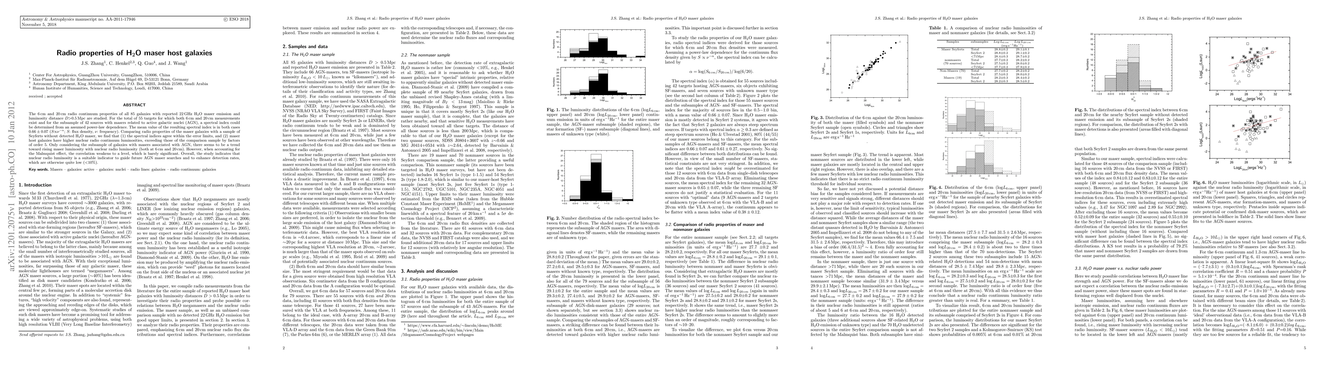 This study investigates the 6 cm and 20 cm radio continuum properties of 85 galaxies with H2O maser emission, finding that maser host galaxies exhibit higher nuclear radio luminosities compared to Seyfert galaxies without masers. The spectral index for both maser-hosting and AGN-related maser galaxies is consistent, suggesting a potential correlation between maser luminosity and nuclear radio luminosity, though this correlation is weakened when considering selection biases.