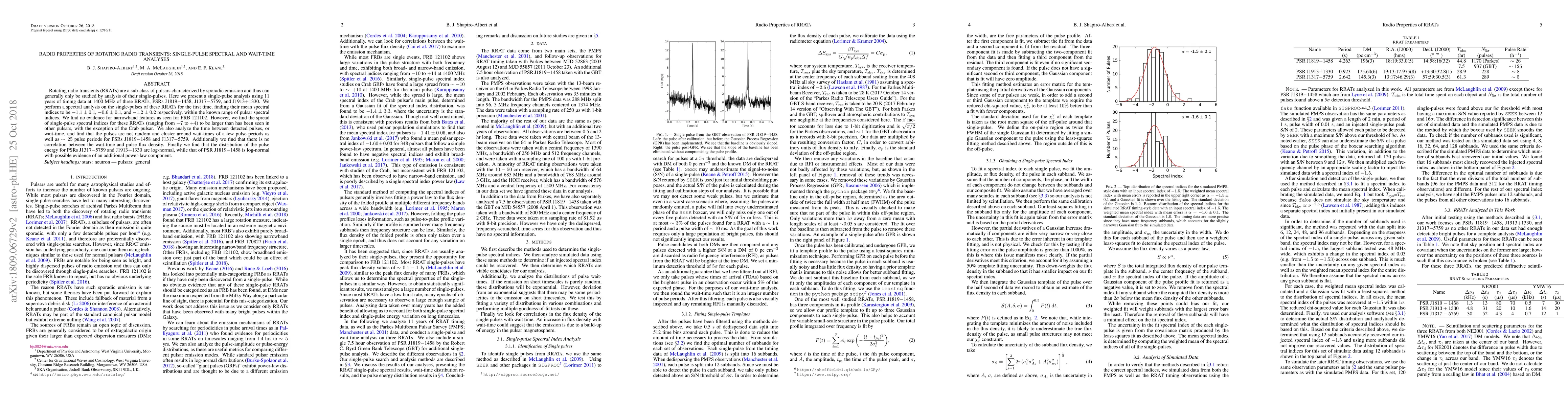 This study analyzes the single-pulse spectral indices and wait times of three rotating radio transients (RRATs), finding mean spectral indices within the range of typical pulsars. The pulse energy distributions show log-normal characteristics, with some evidence of additional power-law components, and pulses cluster around specific wait-time intervals rather than being random.