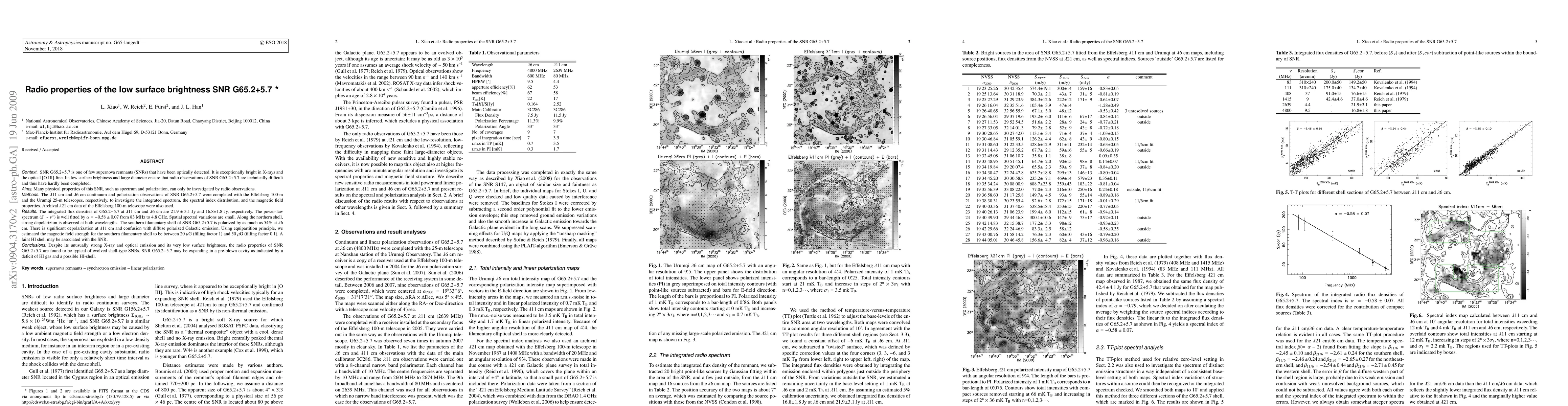 Many physical properties of this SNR such as spectrum and polarization can only be investigated by radio observations. The $\lambda$11 cm and $\lambda$6\ cm continuum and polarization observations of SNR G65.2+5.7 were made with the Effelsberg 100-m and the Urumqi 25-m telescopes, respectively, to investigate the integrated spectrum, the spectral index distribution, and the magnetic field properties. $\lambda$21 cm archival data from the Effelsberg 100-m telescope have been also used. The integrated flux densities of G65.2+5.7 at $\lambda 11$ cm and $\lambda 6$ cm are $21.9\pm3.1$ Jy and 16.8$\pm$1.8 Jy, respectively. The power-law spectrum ($S\sim\nu^{\alpha}$) is well fitted by $\alpha = -0.58\pm0.07$ from 83 MHz to 4.8 GHz. Spatial spectral variations are small. Along the northern shell strong depolarizion is observed at both wavelengths. The southern filamentary shell of SNR G65.2+5.7 is polarized up to 54% at $\lambda 6$ cm. There is significant depolarization at $\lambda 11$ cm and confusion with diffuse polarized Galactic emission. Using equipartition principle, we estimated the magnetic field strength for the southern filamentary shell about 20 $\mu$G (filling factor 1) to 50 $\mu$G (filling factor 0.1). A faint HI shell may be associated with the SNR. Despite its unusual strong X-ray and optical emission and its very low surface brightness, the radio properties of SNR G65.2+5.7 are found to be typical for evolved shell type SNRs. SNR G65.2+5.7 may be expanding in a preblown cavity as indicated by a deficit of HI gas and a possible HI-shell.