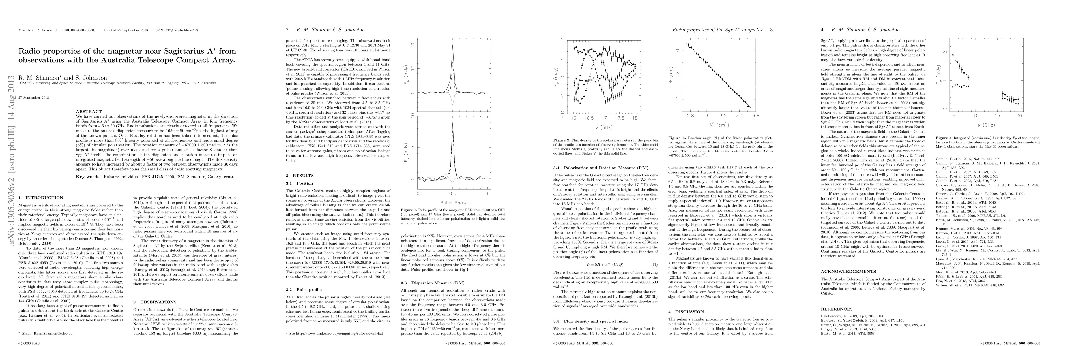 We have carried out observations of the newly-discovered magnetar in the direction of Sagittarius A* using the Australia Telescope Compact Array in four frequency bands from 4.5 to 20 GHz. Radio pulsations are clearly detected at all frequencies. We measure the pulsar's dispersion measure to be 1650 +/- 50 pc/cm^3, the highest of any of the known pulsars. Once Faraday rotation has been taken into account, the pulse profile is more than 80% linearly polarized at all frequencies and has a small degree (5%) of circular polarization. The rotation measure of -67000 +/- 500$ rad/m^2 is the largest (in magnitude) ever measured for a pulsar but still a factor 8 smaller than Sgr A* itself. The combination of the dispersion and rotation measures implies an integrated magnetic field strength of -50uG along the line of sight. The flux density appears to have increased by about a factor of two between observations made 30 days apart. This object therefore joins the small class of radio emitting magnetars.