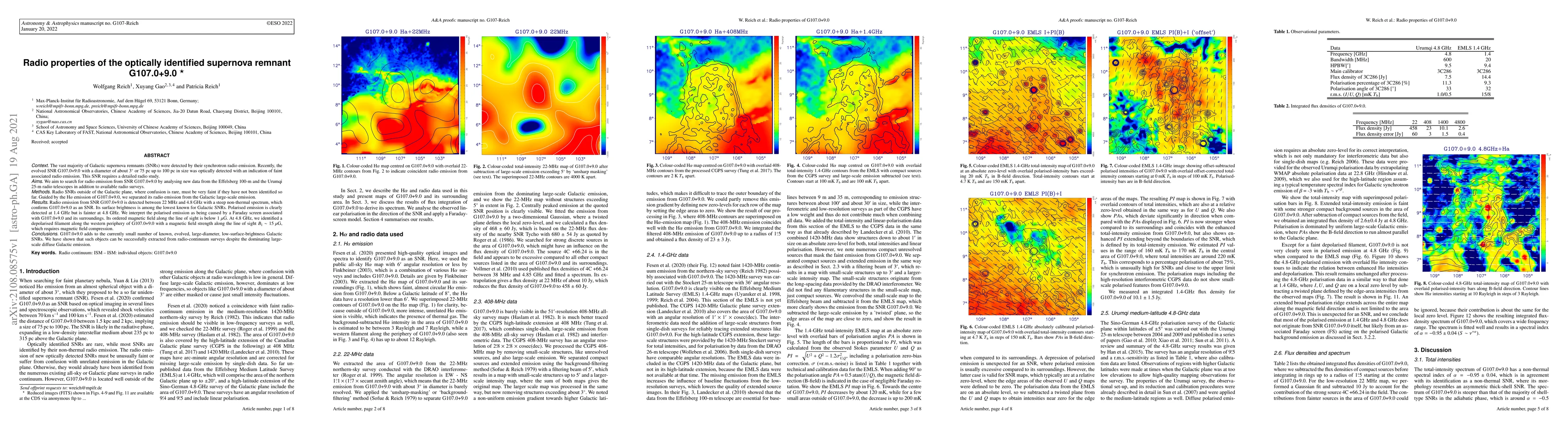 The vast majority of Galactic supernova remnants (SNRs) were detected by their synchrotron radio emission. Recently, the evolved SNR G107.0+9.0 with a diameter of about 3~deg or 75~pc up to 100~pc in size was optically detected with an indication of faint associated radio emission. This SNR requires a detailed radio study. We aim to search for radio emission from SNR G107.0+9.0 by analysing new data from the Effelsberg 100-m and the Urumqi 25-m radio telescopes in addition to available radio surveys. Radio SNRs outside of the Galactic plane, where confusion is rare, must be very faint if they have not been identified so far. Guided by the H$\alpha$ emission of G107.0+9.0, we separated its radio emission from the Galactic large-scale emission. Radio emission from SNR G107.0+9.0 is detected between 22~MHz and 4.8~GHz with a steep non-thermal spectrum, which confirms G107.0+9.0 as an SNR. Its surface brightness is among the lowest known for Galactic SNRs. Polarised emission is clearly detected at 1.4~GHz but is fainter at 4.8~GHz. We interpret the polarised emission as being caused by a Faraday screen associated with G107.0+9.0 and its surroundings. Its ordered magnetic field along the line of sight is below 1~$\mu$G. At 4.8~GHz, we identified a depolarised filament along the western periphery of G107.0+9.0 with a magnetic field strength along the line of sight $B{_{||}} \sim 15~\mu$G, which requires magnetic field compression. G107.0+9.0 adds to the currently small number of known, evolved, large-diameter, low-surface-brightness Galactic SNRs. We have shown that such objects can be successfully extracted from radio-continuum surveys despite the dominating large-scale diffuse Galactic emission.
