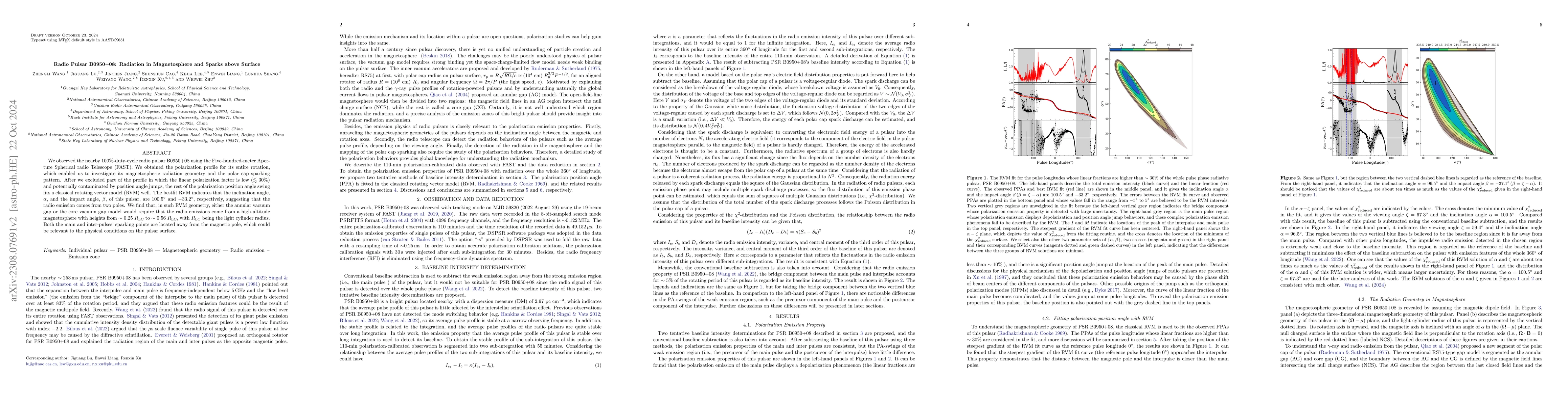 This paper investigates the magnetosphere and polar cap sparking of the radio pulsar B0950+08 using data from the FAST telescope. The study reveals that the radio emission originates from two poles, with sparking occurring at high altitudes in the magnetosphere, providing insights into the pulsar's inner structure.