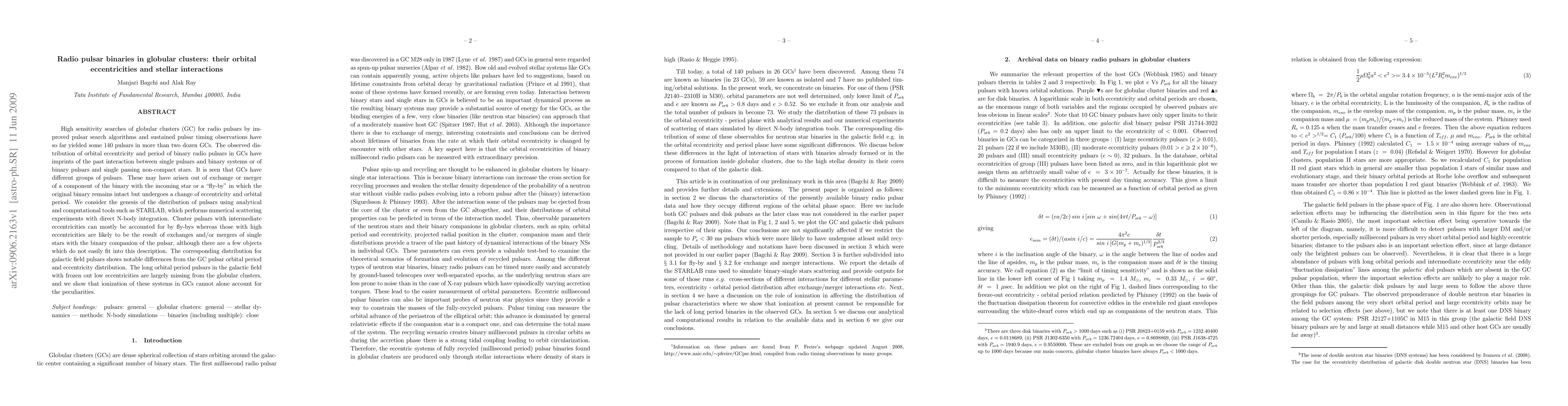 High sensitivity searches of globular clusters (GC) for radio pulsars by improved pulsar search algorithms and sustained pulsar timing observations have so far yielded some 140 pulsars in more than two dozen GCs. The observed distribution of orbital eccentricity and period of binary radio pulsars in GCs have imprints of the past interaction between single pulsars and binary systems or of binary pulsars and single passing non-compact stars. It is seen that GCs have different groups of pulsars. These may have arisen out of exchange or merger of a component of the binary with the incoming star or a "fly-by" in which the original binary remains intact but undergoes a change of eccentricity and orbital period. We consider the genesis of the distribution of pulsars using analytical and computational tools such as STARLAB, which performs numerical scattering experiments with direct N-body integration. Cluster pulsars with intermediate eccentricities can mostly be accounted for by fly-bys whereas those with high eccentricities are likely to be the result of exchanges and/or mergers of single stars with the binary companion of the pulsar, although there are a few objects which do not easily fit into this description. The corresponding distribution for galactic field pulsars shows notable differences from the GC pulsar orbital period and eccentricity distribution. The long orbital period pulsars in the galactic field with frozen out low eccentricities are largely missing from the globular clusters, and we show that ionization of these systems in GCs cannot alone account for the peculiarities.