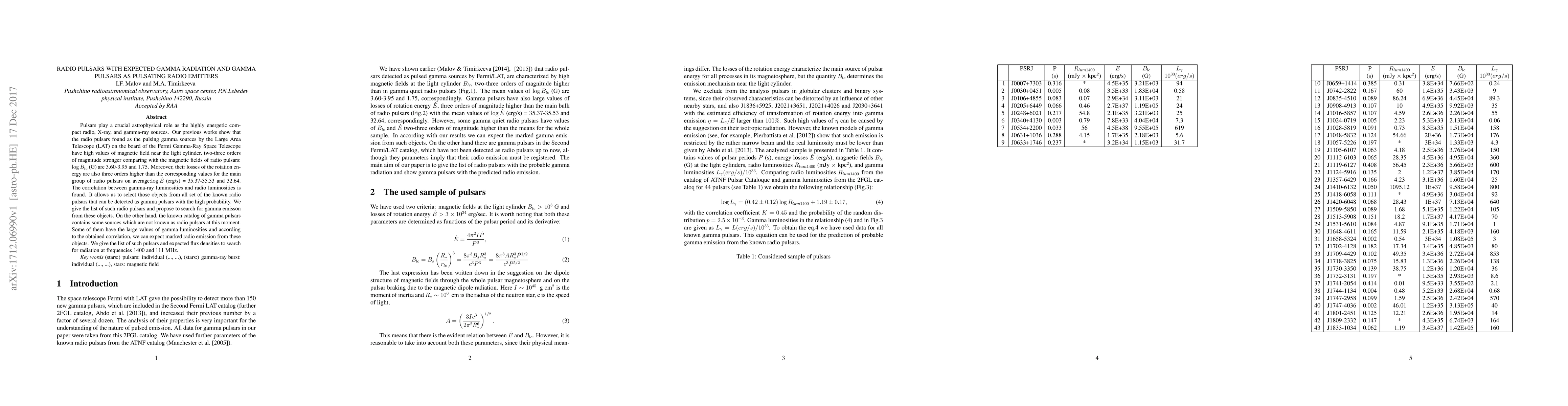 Pulsars play a crucial astrophysical role as the highly energetic compact radio, X-ray, and gamma-ray sources. Our previous works show that the radio pulsars found as the pulsing gamma sources by the Large Area Telescope (LAT) on the board of the Fermi Gamma-Ray Space Telescope have high values of magnetic field near the light cylinder, two-three orders of magnitude stronger comparing with the magnetic fields of radio pulsars: $\log B_{lc}$ (G) are 3.60-3.95 and 1.75. Moreover, their losses of the rotation energy are also three orders higher than the corresponding values for the main group of radio pulsars on average:$\log \dot E$ (erg/s) = 35.37-35.53 and 32.64. The correlation between gamma-ray luminosities and radio luminosities is found. It allows us to select those objects from all set of the known radio pulsars that can be detected as gamma pulsars with the high probability. We give the list of such radio pulsars and propose to search for gamma emisson from these objects. On the other hand, the known catalog of gamma pulsars contains some sources which are not known as radio pulsars at this moment. Some of them have the large values of gamma luminosities and according to the obtained correlation, we can expect marked radio emission from these objects. We give the list of such pulsars and expected flux densities to search for radiation at frequencies 1400 and 111 MHz.