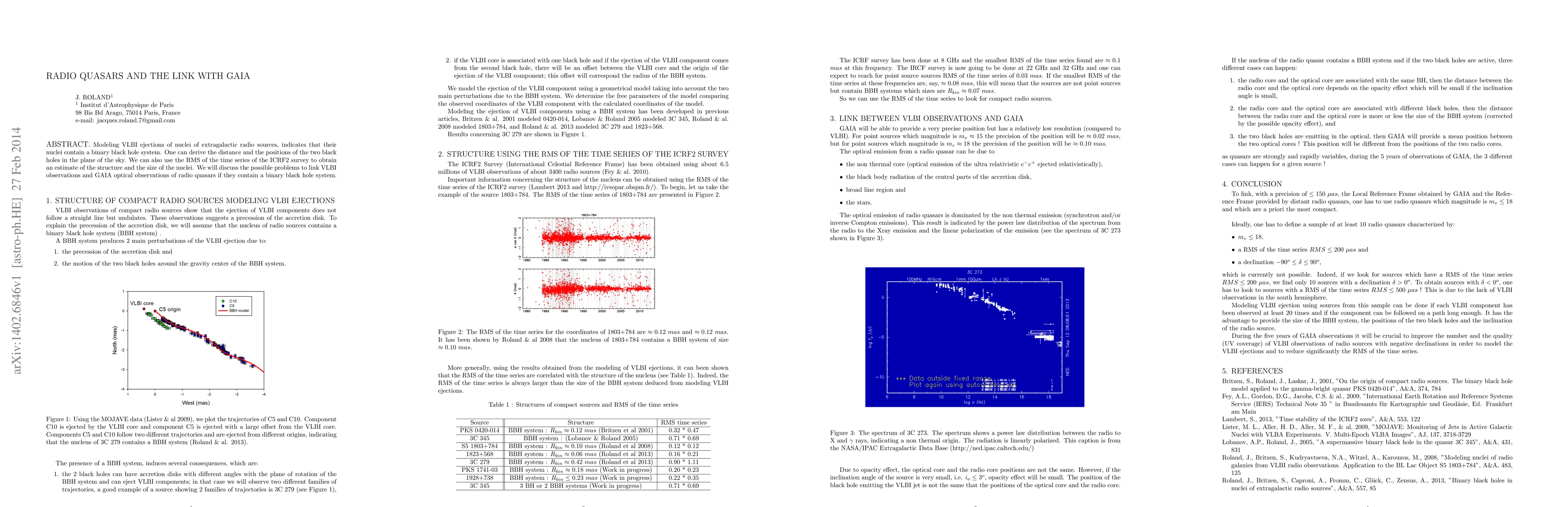 Modeling VLBI ejections of nuclei of extragalactic radio sources, indicates that their nuclei contain a binary black hole system. One can derive the distance and the positions of the two black holes in the plane of the sky. We can also use the RMS of the time series of the ICRF2 survey to obtain an estimate of the structure and the size of the nuclei. We will discuss the possible problems to link VLBI observations and GAIA optical observations of radio quasars if they contain a binary black hole system.