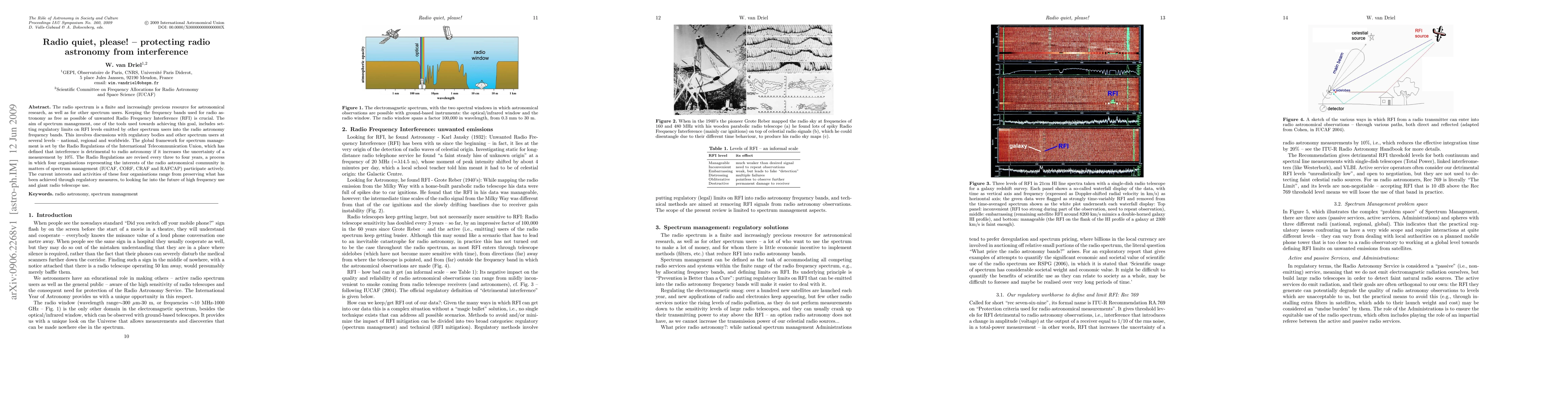 This paper discusses the importance of managing Radio Frequency Interference (RFI) to protect radio astronomy, emphasizing the role of spectrum management and regulatory limits set by international bodies. It highlights the involvement of four key organizations in advocating for radio astronomy interests globally, focusing on both current and future spectrum challenges.