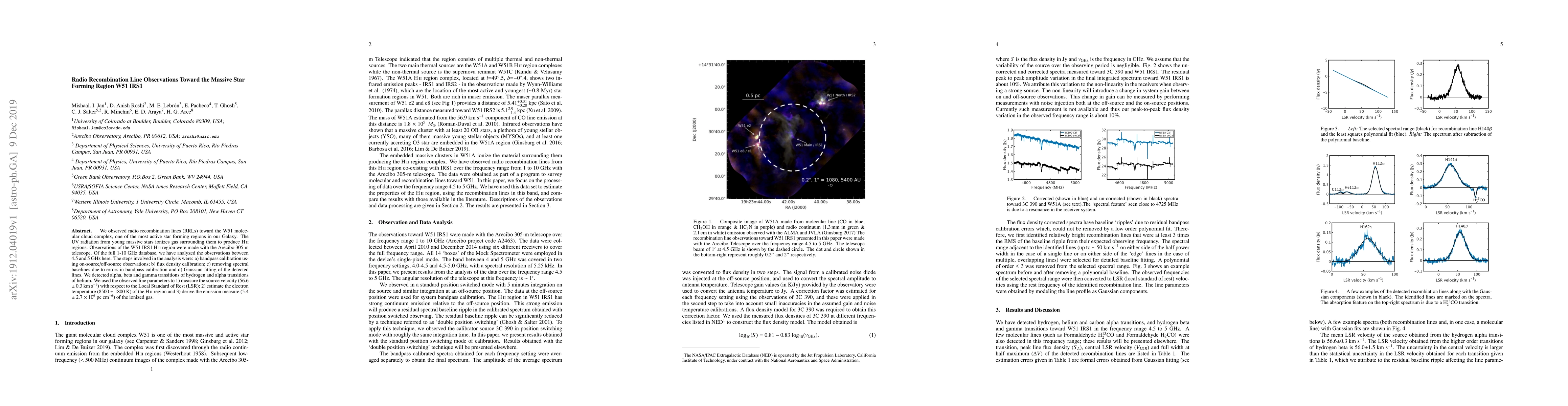 We observed radio recombination lines (RRLs) toward the W51 molecular cloud complex, one of the most active star forming regions in our Galaxy. The UV radiation from young massive stars ionizes gas surrounding them to produce HII regions. Observations of the W51 IRS1 HII region were made with the Arecibo 305 m telescope. Of the full 1-10 GHz database, we have analyzed the observations between 4.5 and 5 GHz here. The steps involved in the analysis were: a) bandpass calibration using on-source/off-source observations; b) flux density calibration; c) removing spectral baselines due to errors in bandpass calibration and d) Gaussian fitting of the detected lines. We detected alpha, beta and gamma transitions of hydrogen and alpha transitions of helium. We used the observed line parameters to 1) measure the source velocity (56.6 $\pm$ 0.3 km s$^{-1}$) with respect to the Local Standard of Rest (LSR); 2) estimate the electron temperature (8500 $\pm$ 1800 K) of the HII region and 3) derive the emission measure (5.4 $\pm$ 2.7 $\times$ 10$^{6}$ pc cm$^{-6}$) of the ionized gas.