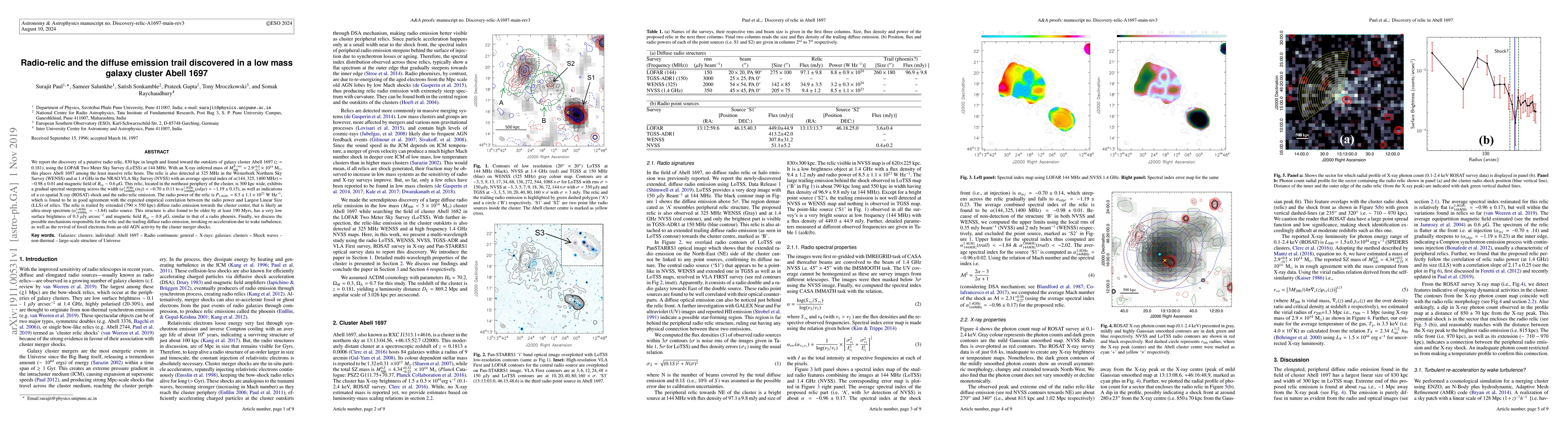 Researchers discovered a 830 kpc-long radio relic in galaxy cluster Abell 1697, which is among the least massive relic hosts, with implications for understanding re-acceleration of fossil electrons and the revival of old AGN activity.