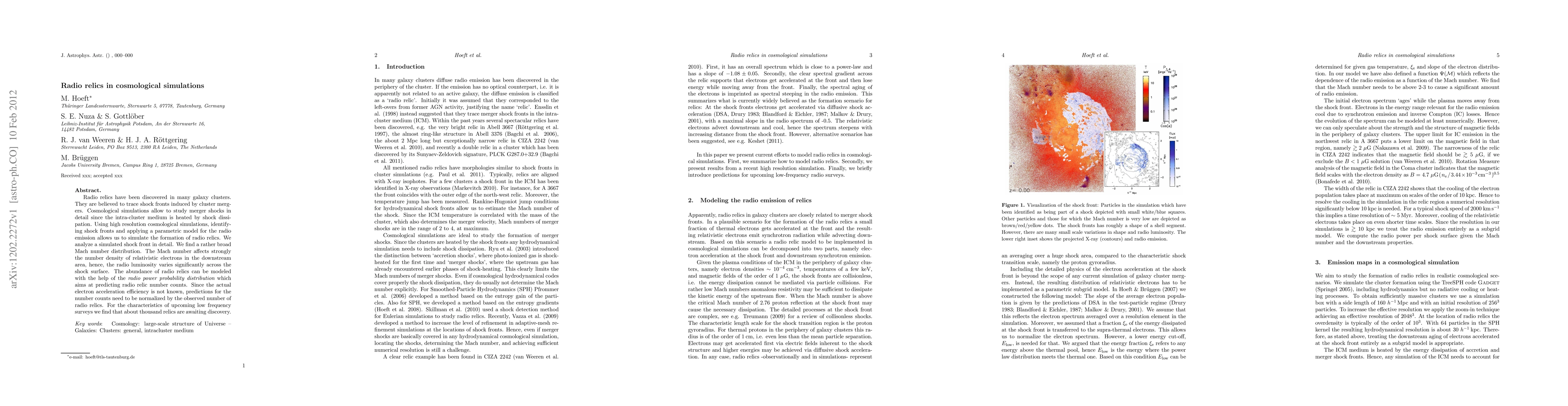 Radio relics have been discovered in many galaxy clusters. They are believed to trace shock fronts induced by cluster mergers. Cosmological simulations allow us to study merger shocks in detail since the intra-cluster medium is heated by shock dissipation. Using high resolution cosmological simulations, identifying shock fronts and applying a parametric model for the radio emission allows us to simulate the formation of radio relics. We analyze a simulated shock front in detail. We find a rather broad Mach number distribution. The Mach number affects strongly the number density of relativistic electrons in the downstream area, hence, the radio luminosity varies significantly across the shock surface. The abundance of radio relics can be modeled with the help of the radio power probability distribution which aims at predicting radio relic number counts. Since the actual electron acceleration efficiency is not known, predictions for the number counts need to be normalized by the observed number of radio relics. For the characteristics of upcoming low frequency surveys we find that about thousand relics are awaiting discovery.