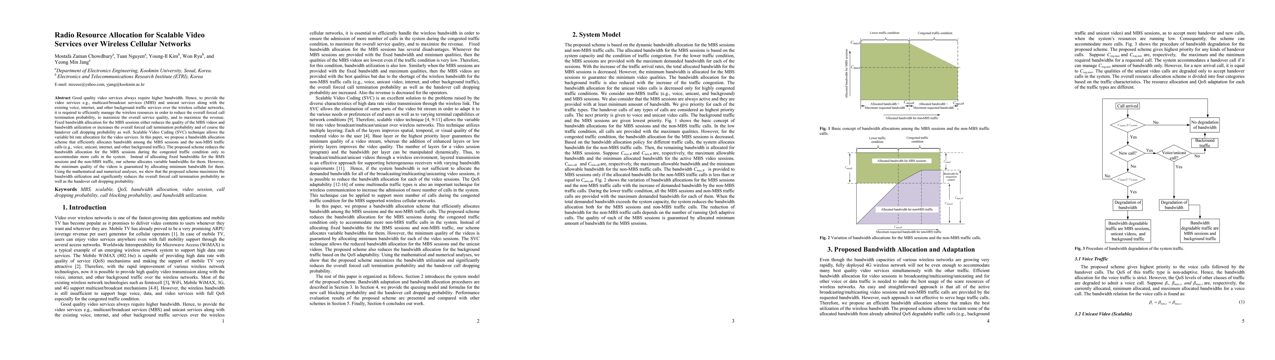 This paper proposes a dynamic radio resource allocation scheme for scalable video services over wireless cellular networks, aiming to maximize bandwidth utilization and service quality while minimizing call terminations and handover drops. The scheme uses Scalable Video Coding to allocate variable bandwidths, reducing MBS bandwidth during congestion to accommodate more calls, thereby enhancing overall network efficiency.