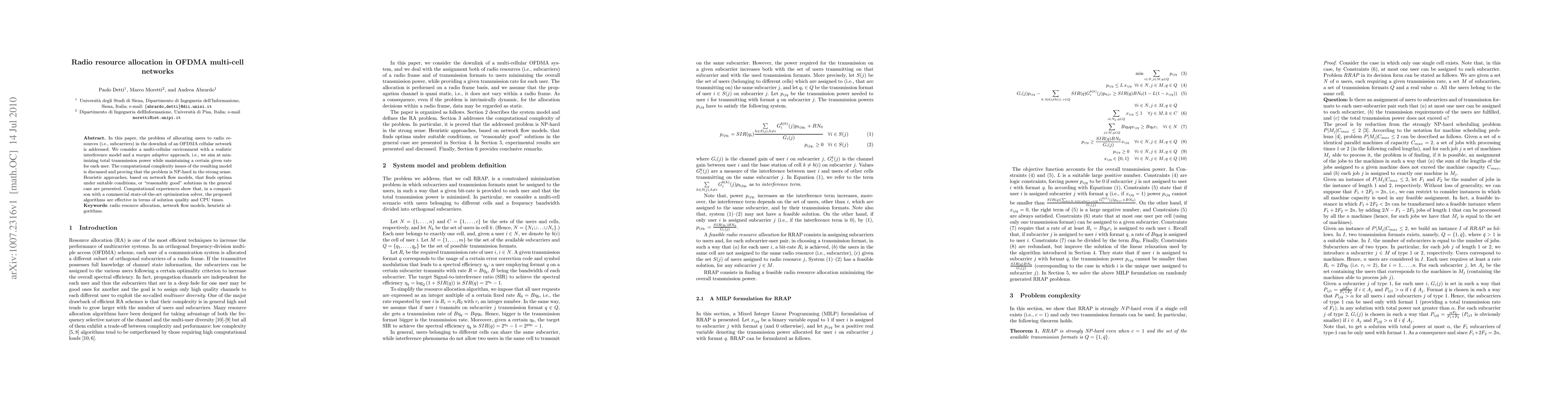 This paper tackles radio resource allocation in OFDMA multi-cell networks to minimize transmission power while maintaining a certain rate for each user, finding the problem is NP-hard and proposing heuristic approaches that offer effective solutions.