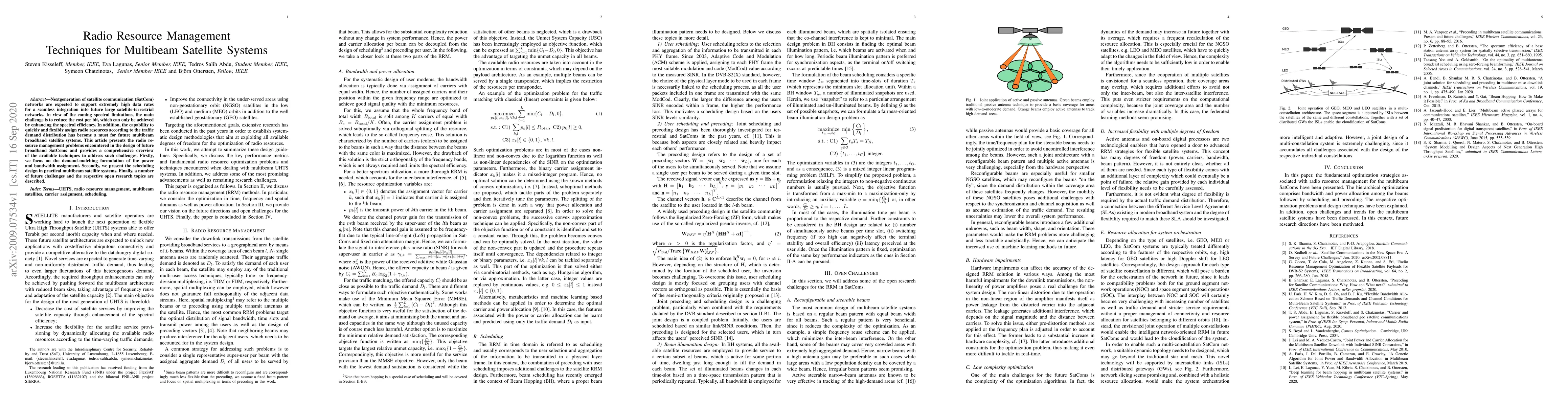 This paper explores radio resource management techniques for next-generation multibeam satellite systems to enhance spectral efficiency and reduce cost per bit. It reviews methods for power and bandwidth assignment, scheduling design, and identifies future challenges and research opportunities.