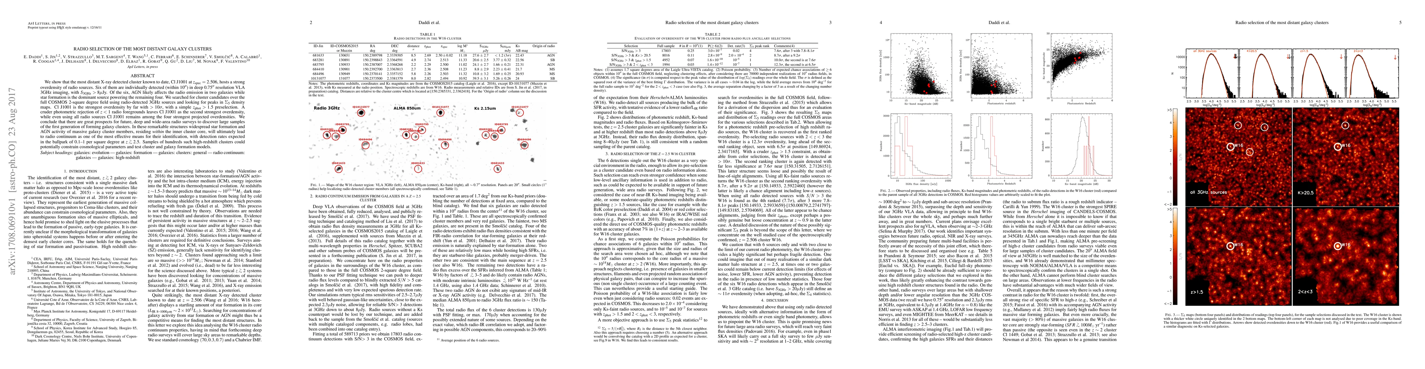 This paper identifies the most distant X-ray cluster, ClJ1001 at z=2.506, which exhibits a significant overdensity of radio sources, indicating widespread star formation and AGN activity. Future deep radio surveys are expected to discover large samples of high-redshift clusters, aiding in the study of cosmology and galaxy formation.