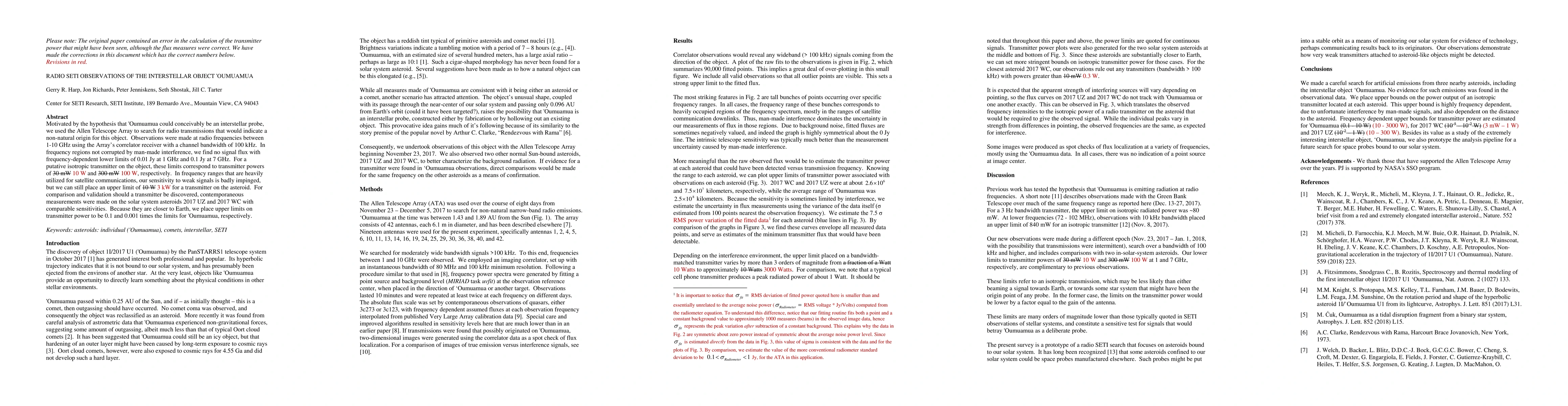 Note: This is a revised version of the paper that _corrects_a_calculation_error in translating observed Jansky units to EIRP in Watts. Mistakes are labeled below. Motivated by the hypothesis that Oumuamua could conceivably be an interstellar probe, we used the Allen Telescope Array to search for radio transmissions that would indicate a non-natural origin for this object. Observations were made at radio frequencies between 1 and 10 GHz using the Array's correlator receiver with a channel bandwidth of 100 kHz. In frequency regions not corrupted by man-made interference, we find no signal flux with frequency-dependent lower limits of 0.01 Jy at 1 GHz and 0.1 Jy at 7 GHz. For a putative isotropic object, these limits correspond to transmitter powers of (was mistakenly 30 mW) 10 W and (was mistakenly 300 mW) 100 W, respectively. In frequency ranges that are heavily utilized for satellite communications, our sensitivity to weak signals is badly impinged, but we can still place an upper limit of (was mistakenly 10 W) 3 kW for a transmitter on the asteroid. For comparison and validation should a transmitter be discovered, contemporaneous measurements were made on the solar system asteroids 2017 UZ and 2017 WC with comparable sensitivities. Because they are closer to Earth, we place upper limits on transmitter power to be 0.1 and 0.001 times the limits for Oumuamua, respectively.
