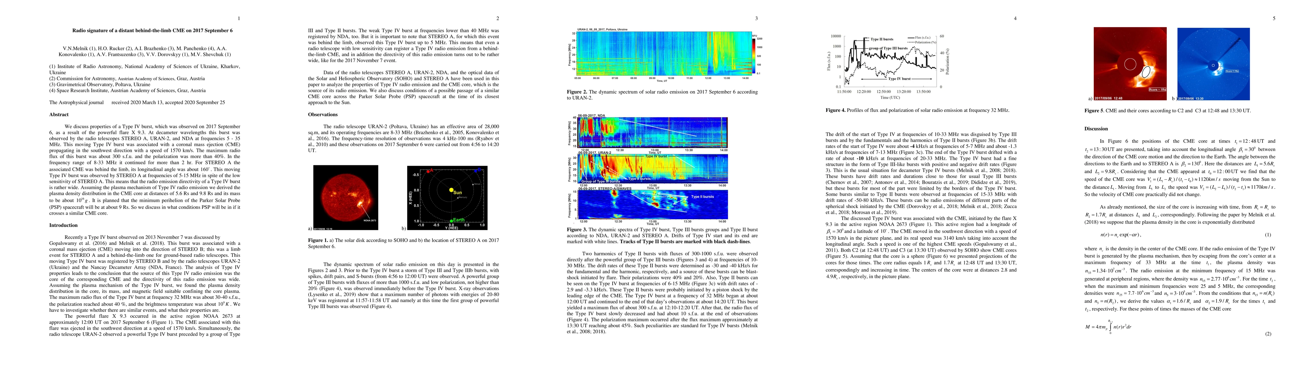 We discuss properties of a Type IV burst, which was observed on 2017 September 6, as a result of the powerful flare X 9.3. At decameter wavelengths this burst was observed by the radio telescopes STEREO A, URAN-2, and NDA at frequencies 5 - 35 MHz. This moving Type IV burst was associated with a coronal mass ejection (CME) propagating in the southwest direction with a speed of 1570 km/s. The maximum radio flux of this burst was about 300 s.f.u. and the polarization was more than 40%. In the frequency range of 8-33 MHz it continued for more than 2 hr. For STEREO A the associated CME was behind the limb, its longitudinal angle was about 160 degrees. This moving Type IV burst was observed by STEREO A at frequencies of 5-15 MHz in spite of the low sensitivity of STEREO A. This means that the radio emission directivity of a Type IV burst is rather wide. Assuming the plasma mechanism of Type IV radio emission we derived the plasma density distribution in the CME core at distances of 5.6 Rs and 9.8 Rs and its mass to be about 10^16 g . It is planned that the minimum perihelion of the Parker Solar Probe (PSP) spacecraft will be at about 9 Rs. So we discuss in what conditions PSP will be in if it crosses a similar CME core.