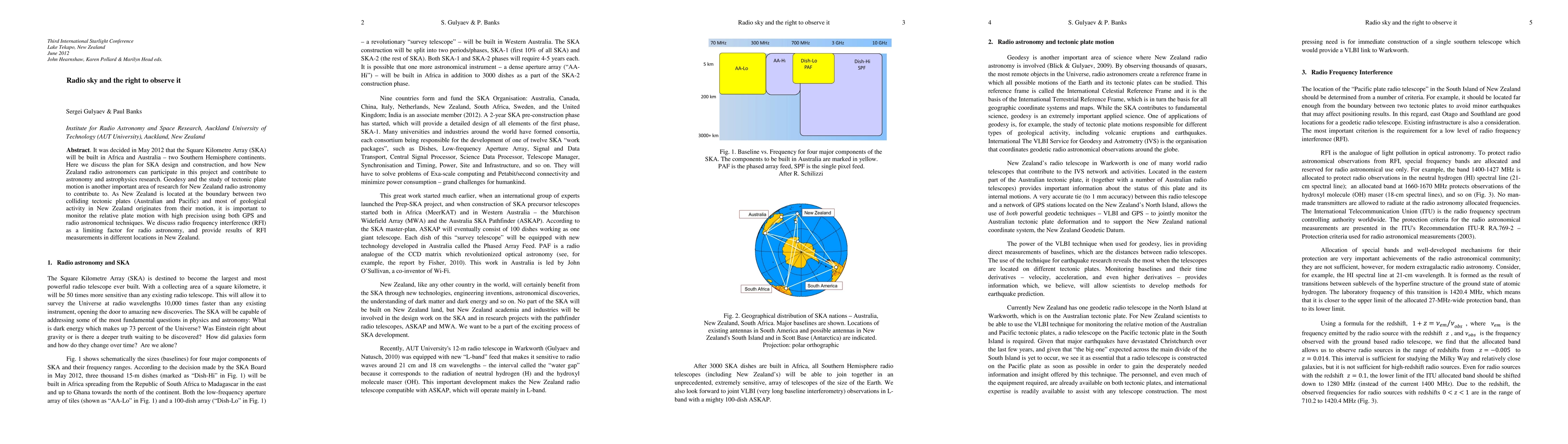 The paper discusses the Square Kilometre Array (SKA) project's Southern Hemisphere sites in Africa and Australia, emphasizing New Zealand's potential involvement. It highlights the importance of New Zealand's unique geological position for studying tectonic plate motion using GPS and radio astronomy, while addressing radio frequency interference (RFI) as a challenge in radio astronomy, presenting RFI measurement results in New Zealand.