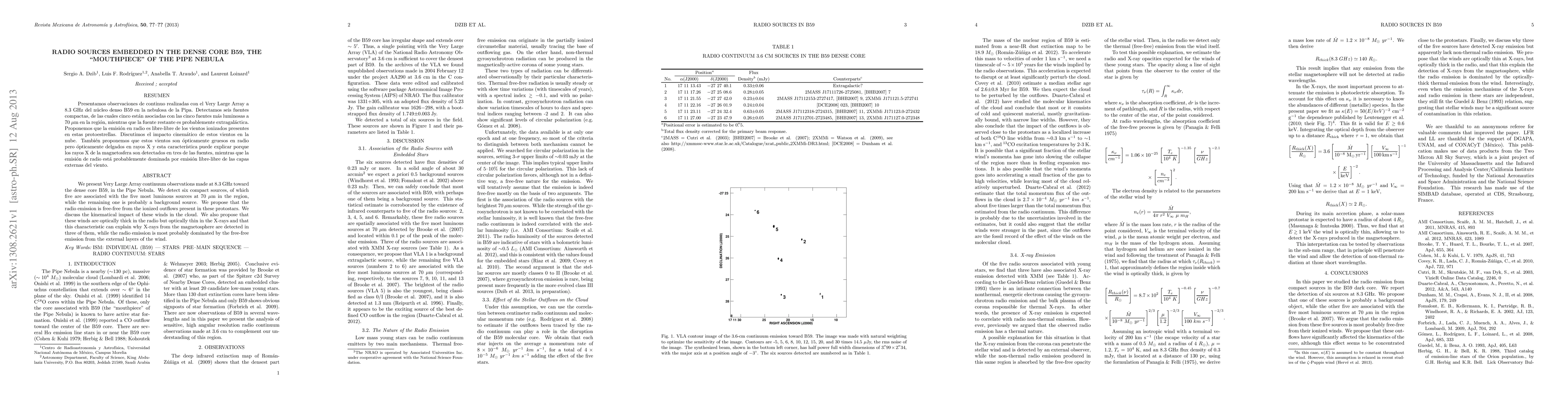 We present Very Large Array continuum observations made at 8.3 GHz toward the dense core B59, in the Pipe Nebula. We detect six compact sources, of which five are associated with the five most luminous sources at 70 micrometer in the region, while the remaining one is probably a background source. We propose that the radio emission is free-free from the ionized outflows present in these protostars. We discuss the kinematical impact of these winds in the cloud. We also propose that these winds are optically thick in the radio but optically thin in the X-rays and that this characteristic can explain why X-rays from the magnetosphere are detected in three of them, while the radio emission is most probably dominated by the free-free emission from the external layers of the wind.