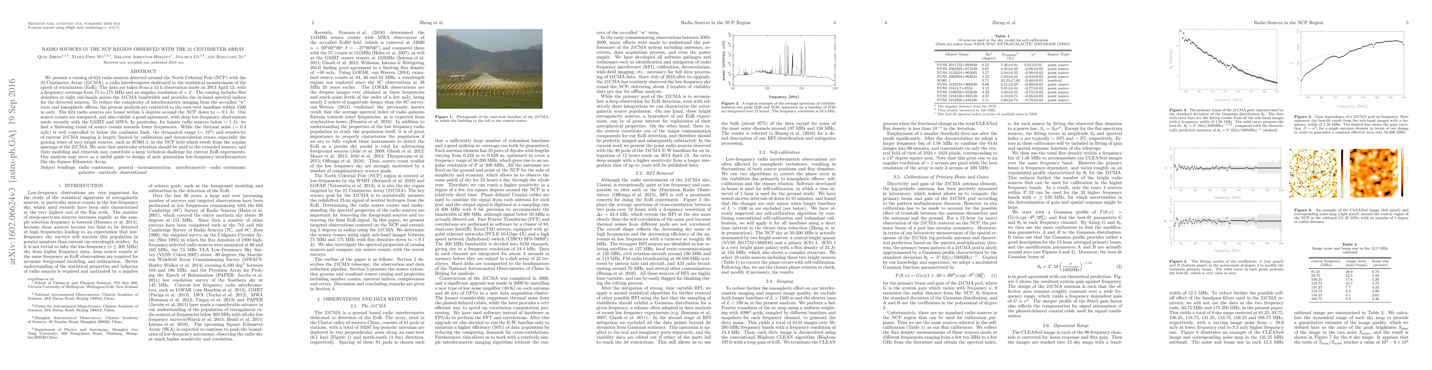 We present a catalog of 624 radio sources detected around the North Celestial Pole (NCP) with the 21 Centimeter Array (21CMA), a radio interferometer dedicated to the statistical measurement of the epoch of reionization (EoR). The data are taken from a 12 h observation made on 2013 April 13, with a frequency coverage from 75 to 175 MHz and an angular resolution of ~ 4 arcmin. The catalog includes flux densities at eight sub-bands across the 21CMA bandwidth and provides the in-band spectral indices for the detected sources. To reduce the complexity of interferometric imaging from the so-called "w" term and ionospheric effects, the present analysis are restricted to the east-west baselines within 1500 m only. The 624 radio sources are found within 5 degrees around the NCP down to ~ 0.1 Jy. Our source counts are compared, and also exhibit a good agreement, with deep low-frequency observations made recently with the GMRT and MWA. In particular, for fainter radio sources below ~ 1 Jy, we find a flattening trend of source counts towards lower frequencies. While the thermal noise (~0.4 mJy) is well controlled to below the confusion limit, the dynamical range (~10^4) and sensitivity of current 21CMA imaging is largely limited by calibration and deconvolution errors, especially the grating lobes of very bright sources, such as 3C061.1, in the NCP field which result from the regular spacings of the 21CMA. We note that particular attention should be paid to the extended sources, and their modeling and removals may constitute a large technical challenge for current EoR experiments. Our analysis may serve as a useful guide to design of next generation low-frequency interferometers like the Square Kilometre Array.