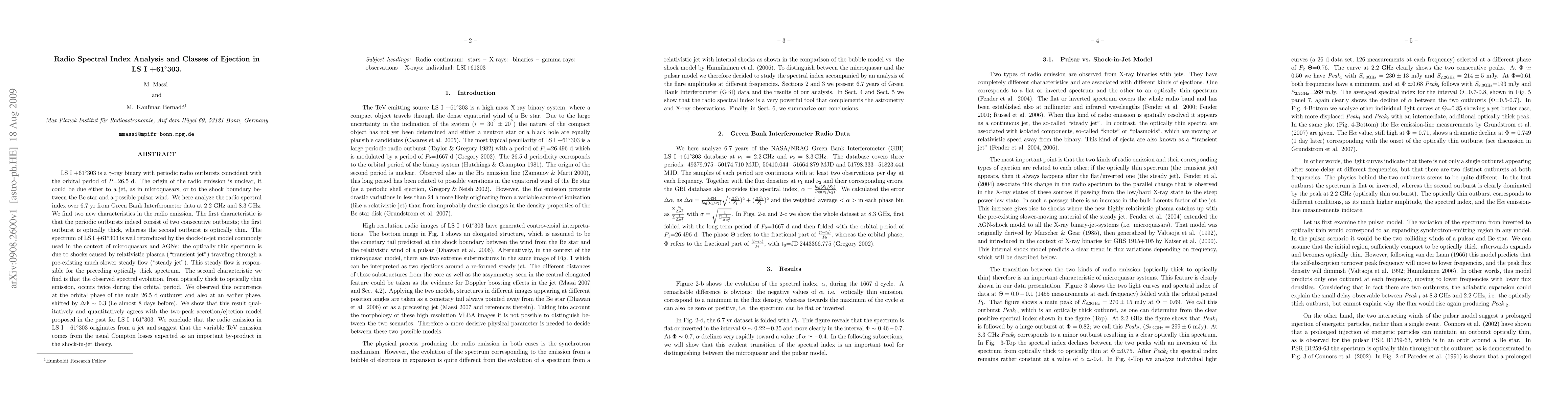 LS I +61303 is a gamma-ray binary with periodic radio outbursts coincident with the orbital period of P=26.5 d. The origin of the radio emission is unclear,it could be due either to a jet, as in microquasars, or to the shock boundary between the Be star and a possible pulsar wind. We here analyze the radio spectral index over 6.7 yr from Green Bank Interferometer data at 2.2 GHz and 8.3 GHz. We find two new characteristics in the radio emission. The first characteristic is that the periodic outbursts indeed consist of two consecutive outbursts; the first outburst is optically thick, whereas the second outburst is optically thin. The spectrum of LS I +61 303 is well reproduced by the shock-in-jet model commonly used in the context of microquasars and AGNs: the optically thin spectrum is due to shocks caused by relativistic plasma ("transient jet") traveling through a pre-existing much slower steady flow ("steady jet"). This steady flow is responsible for the preceding optically thick spectrum. The second characteristic we find is that the observed spectral evolution, from optically thick to optically thin emission, occurs twice during the orbital period. We observed this occurrence at the orbital phase of the main 26.5 d outburst and also at an earlier phase, shifted by $\Delta \Phi \sim$ 0.3 (i.e almost 8 days before). We show that this result qualitatively and quantitatively agrees with the two-peak accretion/ejection model proposed in the past for LS I +61303. We conclude that the radio emission in LS I +61303 originates from a jet and suggest that the variable TeV emission comes from the usual Compton losses expected as an important by-product in the shock-in-jet theory.