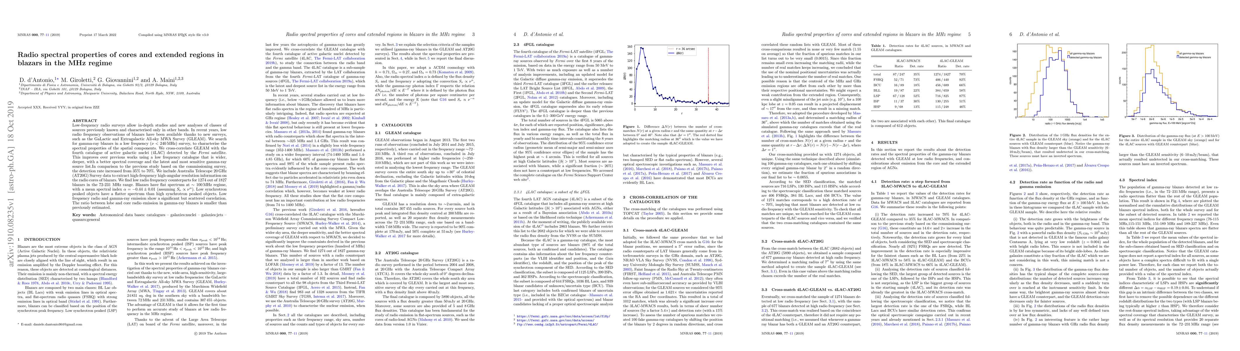 This study investigates the radio spectral properties of blazar cores and extended regions at low frequencies, revealing a mean spectral index of -0.44 and a significant correlation between low frequency radio and gamma-ray emission.
