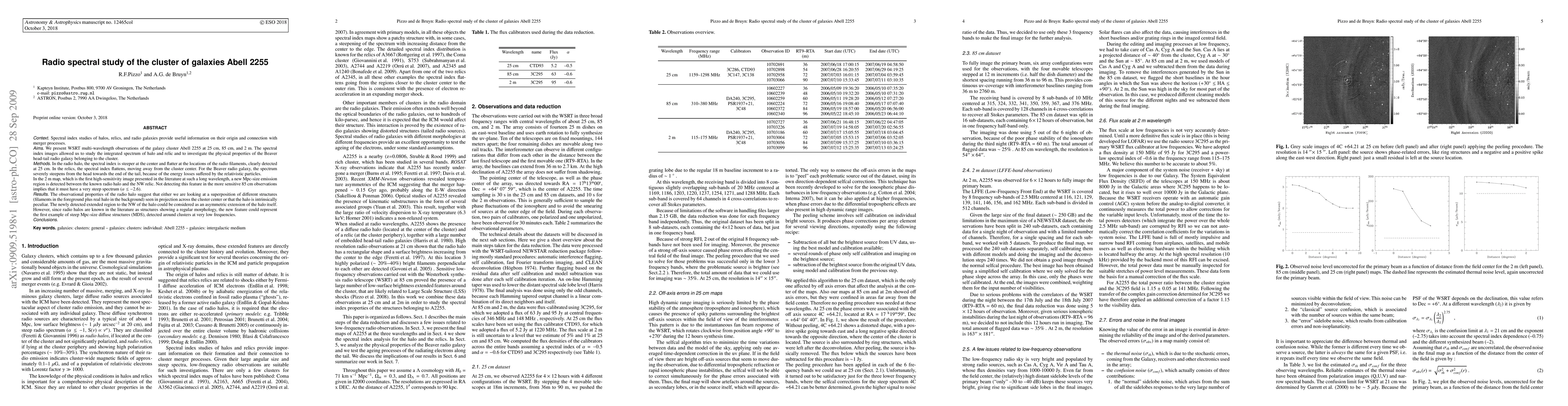Spectral index studies of halos, relics, and radio galaxies provide useful information on their origin and connection with merger processes. We present WSRT multi-wavelength observations of the galaxy cluster Abell 2255 at 25 cm, 85 cm, and 2 m. The spectral index images allowed us to study the integrated spectrum of halo and relic and to investigate the physical properties of the Beaver head-tail radio galaxy belonging to the cluster. In the radio halo, the spectral index is steeper at the center and flatter at the locations of the radio filaments, clearly detected at 25 cm. In the relics, the spectral index flattens, moving away from the cluster center. For the Beaver radio galaxy, the spectrum severely steepens from the head towards the end of the tail, because of the energy losses suffered by the relativistic particles. In the 2 m map, which is the first high-sensitivity image presented in the literature at such a long wavelength, a new Mpc-size emission region is detected between the known radio halo and the NW relic. Not detecting this feature in the more sensitive 85 cm observations implies that it must have a very steep spectrum (alpha <= -2.6). The observational properties of the radio halo suggest that either we are looking at a superposition of different structures (filaments in the foreground plus real halo in the background) seen in projection across the cluster center or that the halo is intrinsically peculiar. The newly detected extended region to the NW of the halo could be considered as an asymmetric extension of the halo itself. However, since radio halos are known in the literature as structures showing a regular morphology, the new feature could represent the first example of steep Mpc-size diffuse structures (MDS), detected around clusters at very low frequencies.