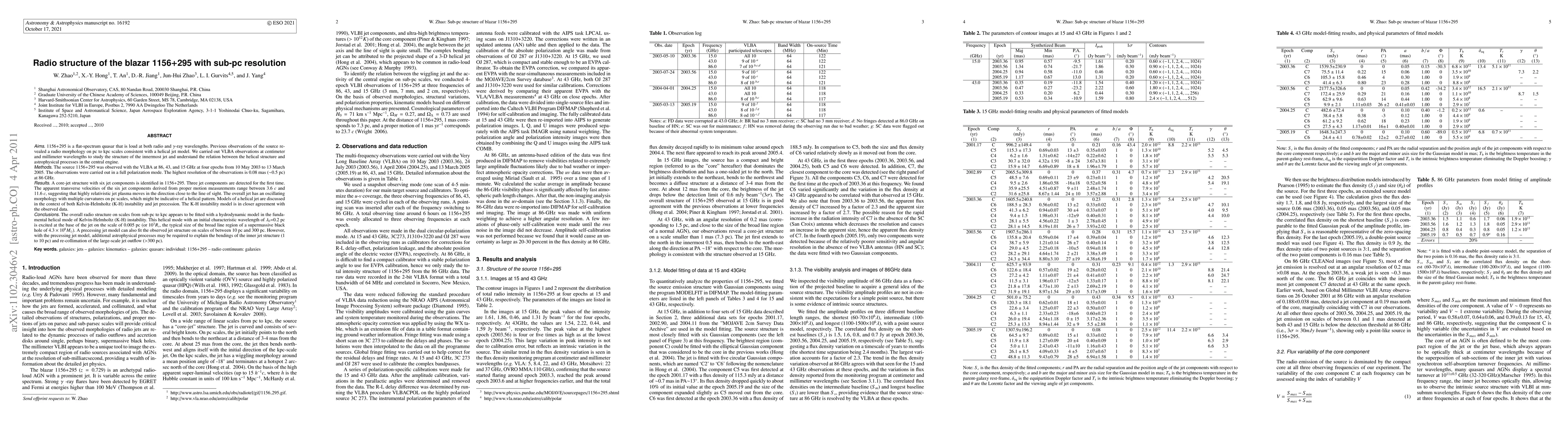 This study uses VLBA observations to reveal a core-jet structure with six components in the blazar 1156+295, showing oscillatory morphology indicative of a helical jet. The observed helical pattern aligns better with a Kelvin-Helmholtz instability model than with jet precession.