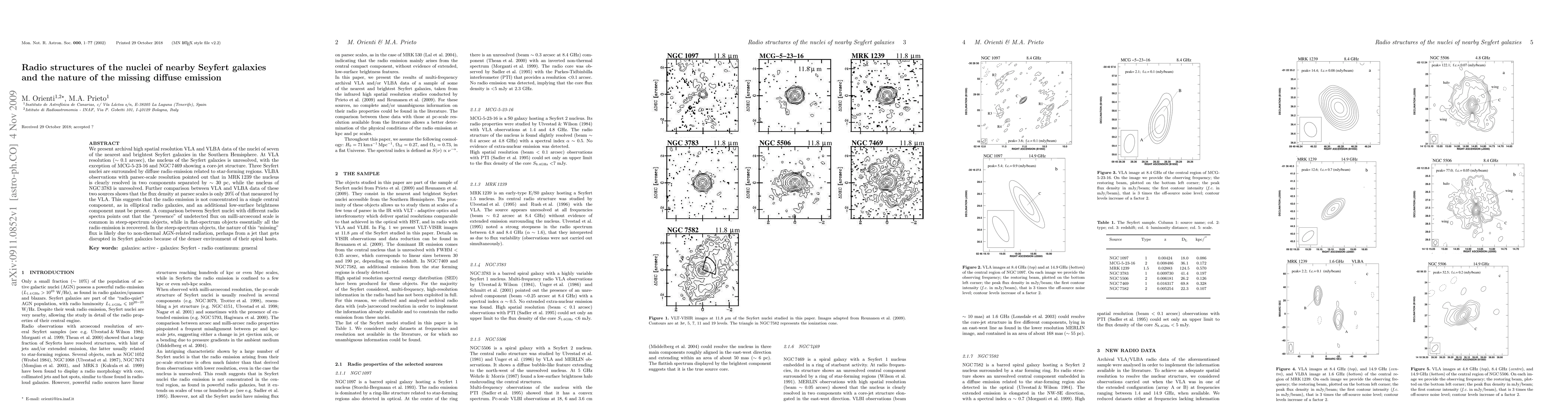 This study uses high-resolution VLA and VLBA data to analyze the radio structures of nearby Seyfert galaxies' nuclei, revealing that most are unresolved but some show core-jet structures. The missing diffuse emission is likely due to non-thermal AGN-related radiation, possibly from disrupted jets in denser environments.