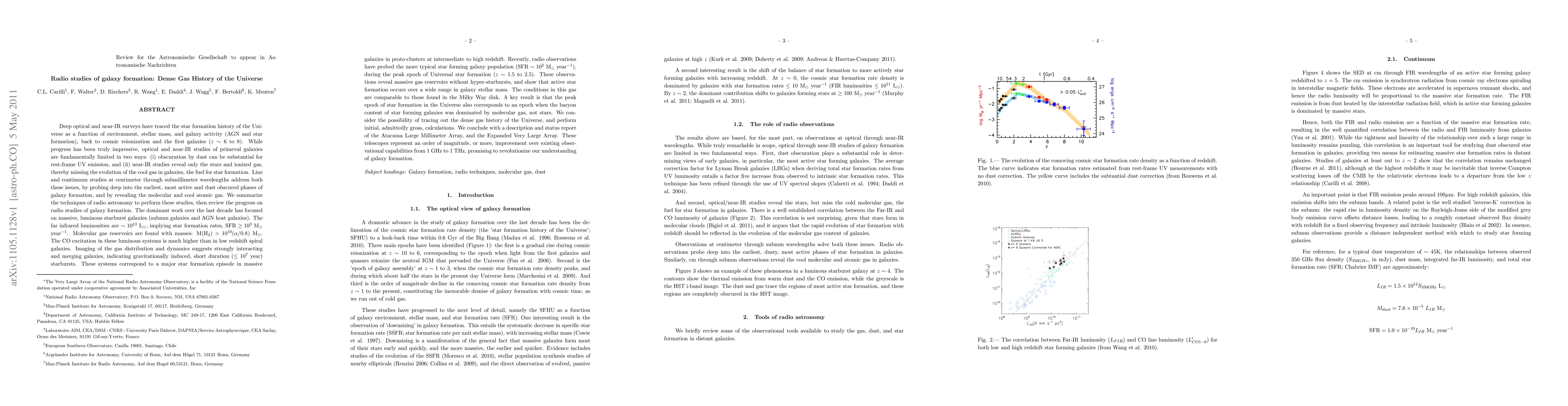 This paper reviews radio astronomy techniques used to study galaxy formation, focusing on the dense gas history of the universe. It highlights the significant star formation in massive, luminous starburst galaxies, and reveals that the peak epoch of universal star formation corresponds to an era dominated by molecular gas rather than stars.