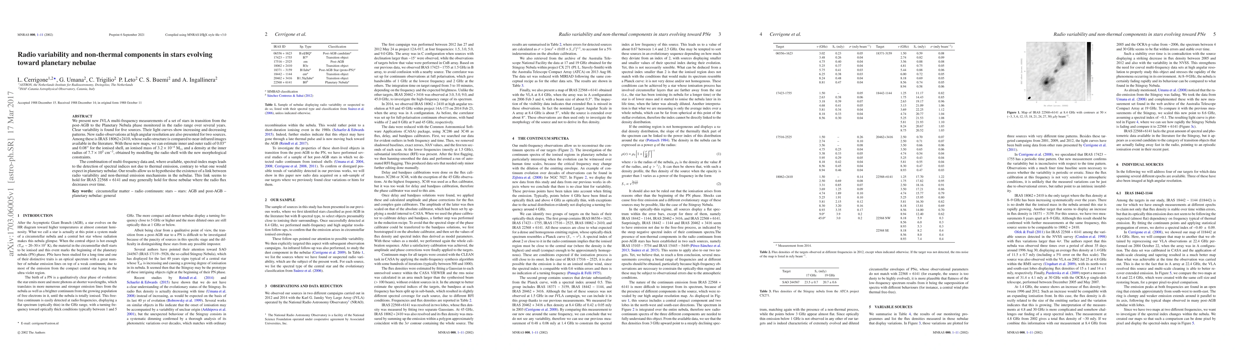 This paper reports on JVLA multi-frequency radio observations of stars transitioning from post-AGB to planetary nebulae, revealing variability in five sources and non-thermal spectral indices in their light curves. For IRAS 18062+2410, high-resolution radio maps suggest an ionised shell with an estimated mass and density, indicating a possible link between radio variability and non-thermal emission mechanisms in these nebulae.