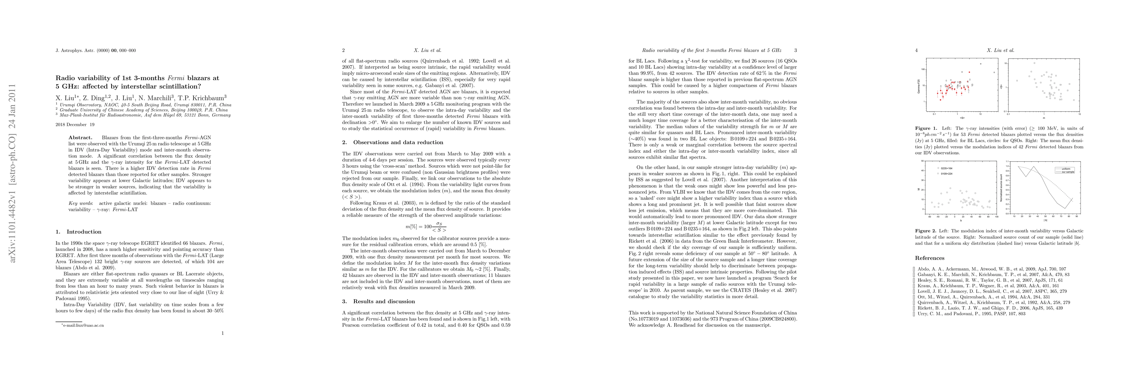 Blazars from the first-three-months Fermi-AGN list were observed with the Urumqi 25m radio telescope at 5GHz in IDV (Intra-Day Variability) mode and inter-month observation mode. A significant correlation between the flux density at 5GHz and the gamma-ray intensity for the Fermi-LAT detected blazars is seen. There is a higher IDV detection rate in Fermi detected blazars than those reported for other samples. Stronger variability appears at lower Galactic latitudes; IDV appears to be stronger in weaker sources, indicating that the variability is affected by interstellar scintillation.