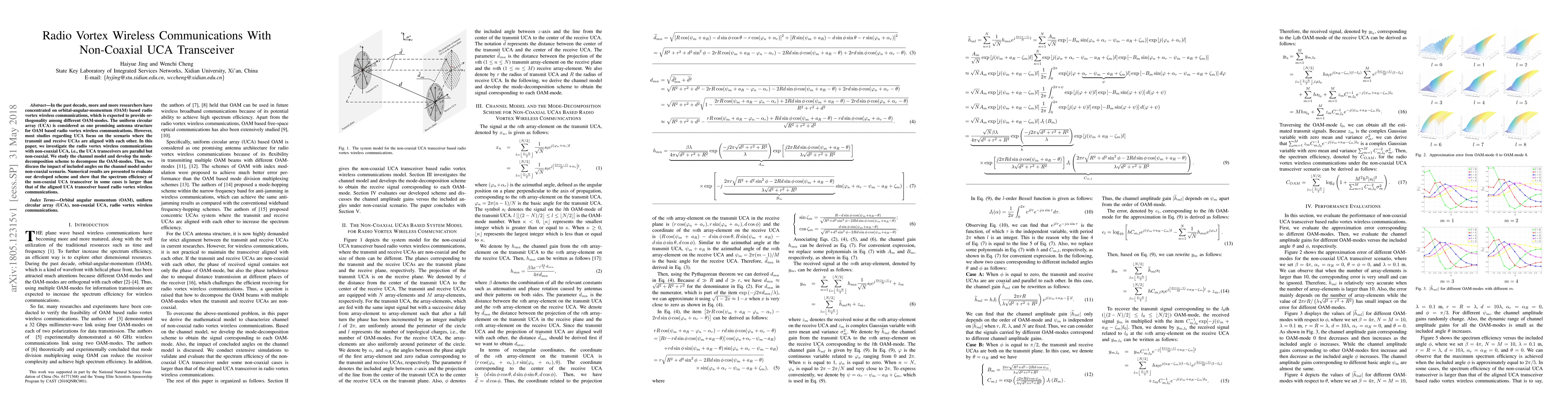 This paper explores radio vortex wireless communications using non-coaxial uniform circular array (UCA) transceivers, developing a mode-decomposition scheme to analyze the channel model and the impact of included angles. Numerical results indicate that non-coaxial UCA transceivers can achieve higher spectrum efficiency compared to aligned UCA transceivers.