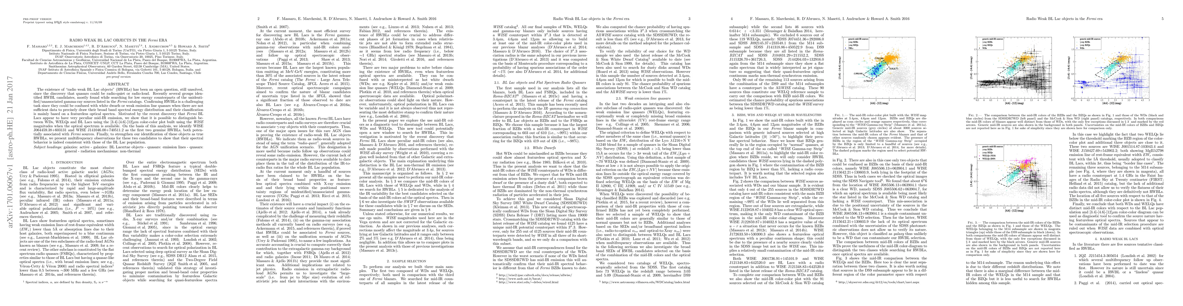 This paper identifies the first confirmed "radio weak BL Lac objects" (RWBLs) using data from the Fermi catalog and WISE infrared observations. It distinguishes RWBLs from white dwarfs and weak emission line quasars using mid-IR color-color plots, confirming WISE J064459.38+603131 and WISE J141046.00+740511.2 as RWBLs through multifrequency spectral analysis.