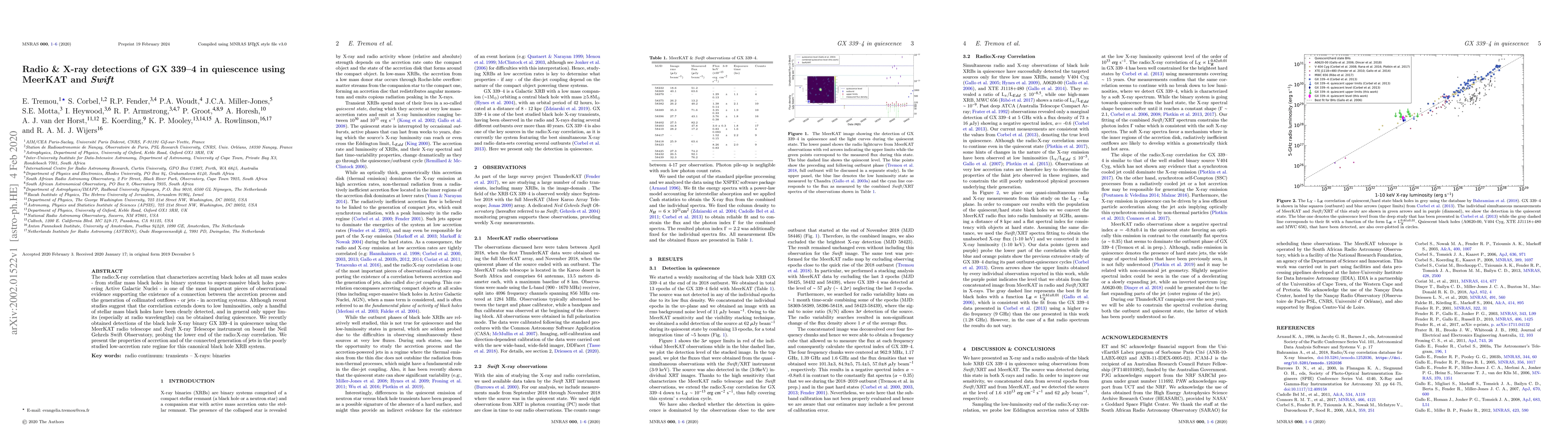 The radio:X-ray correlation that characterises accreting black holes at all mass scales - from stellar mass black holes in binary systems to super-massive black holes powering Active Galactic Nuclei - is one of the most important pieces of observational evidence supporting the existence of a connection between the accretion process and the generation of collimated outflows - or jets - in accreting systems. Although recent studies suggest that the correlation extends down to low luminosities, only a handful of stellar mass black holes have been clearly detected, and in general only upper limits (especially at radio wavelengths) can be obtained during quiescence. We recently obtained detections of the black hole X-ray binary GX 339--4 in quiescence using the MeerKAT radio telescope and Swift X-ray Telescope instrument onboard the Neil Gehrels Swift Observatory, probing the lower end of the radio:X-ray correlation. We present the properties of accretion and of the connected generation of jets in the poorly studied low-accretion rate regime for this canonical black hole XRB system.