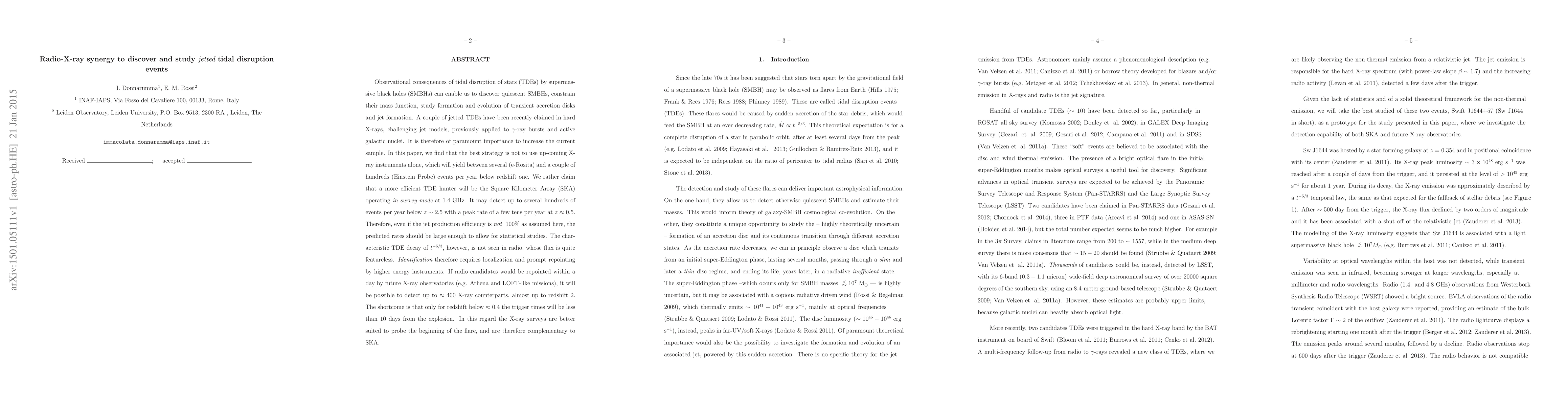 This paper explores the discovery and study of jetted tidal disruption events (TDEs) via radio-X-ray synergy. It argues that the Square Kilometer Array (SKA) in survey mode at 1.4 GHz will be more effective than upcoming X-ray instruments in detecting hundreds of TDEs per year, while X-ray observatories like Athena and LOFT-like missions will be crucial for prompt repointing and identification of these events.