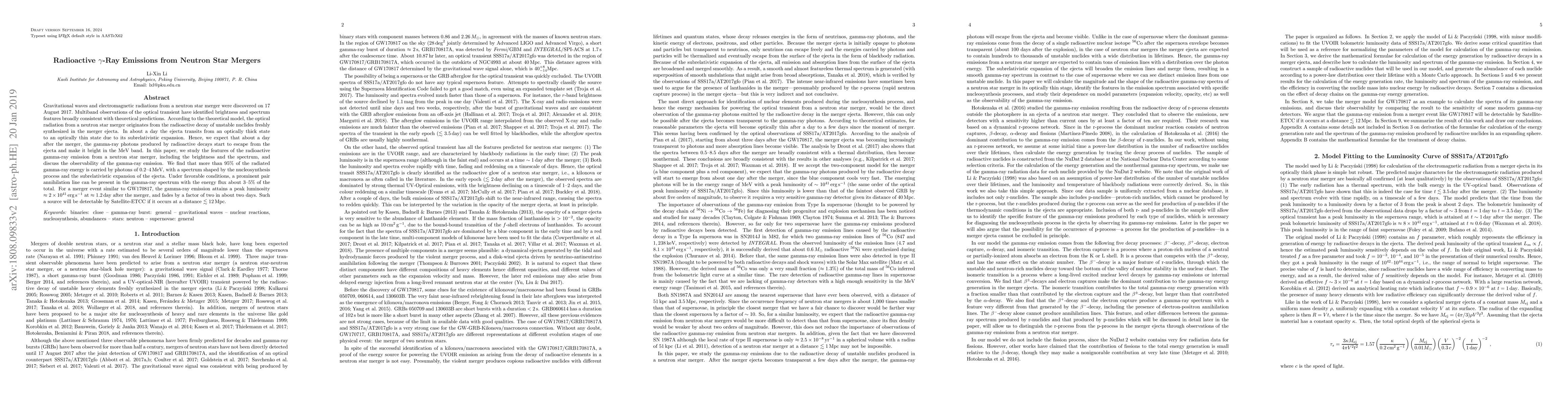 This paper investigates the radioactive gamma-ray emissions from neutron star mergers, finding that over $95\%$ of the emitted gamma-ray energy is in the $0.2$-$4$ MeV range, with a peak luminosity of $\approx 2\times 10^{41}$erg s$^{-1}$ around $1.2$ days post-merger, detectable by Satellite-ETCC at distances up to $12$ Mpc.