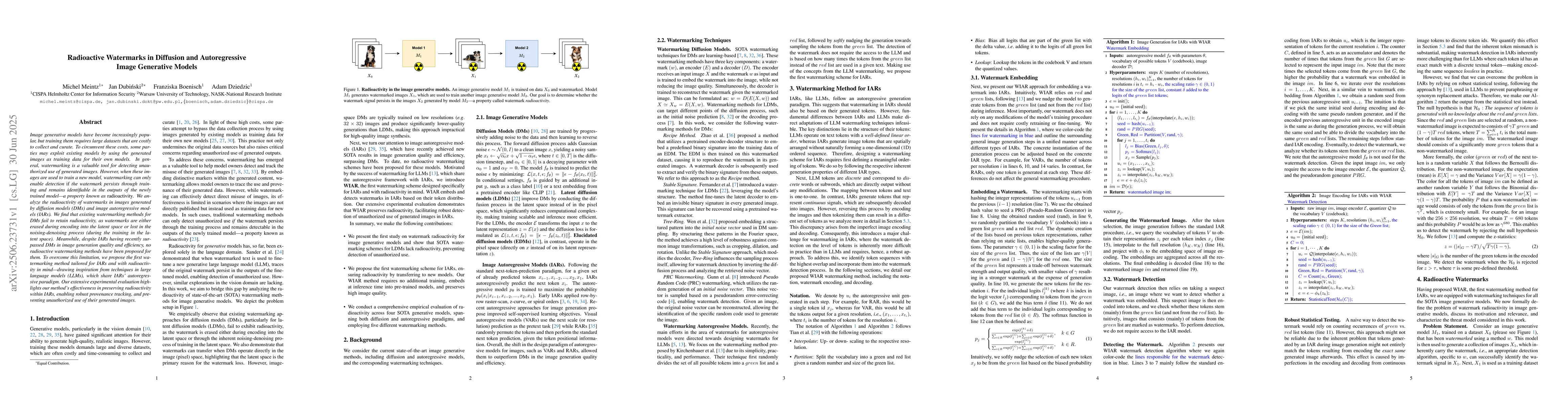 Image generative models have become increasingly popular, but training them requires large datasets that are costly to collect and curate. To circumvent these costs, some parties may exploit existing models by using the generated images as training data for their own models. In general, watermarking is a valuable tool for detecting unauthorized use of generated images. However, when these images are used to train a new model, watermarking can only enable detection if the watermark persists through training and remains identifiable in the outputs of the newly trained model - a property known as radioactivity. We analyze the radioactivity of watermarks in images generated by diffusion models (DMs) and image autoregressive models (IARs). We find that existing watermarking methods for DMs fail to retain radioactivity, as watermarks are either erased during encoding into the latent space or lost in the noising-denoising process (during the training in the latent space). Meanwhile, despite IARs having recently surpassed DMs in image generation quality and efficiency, no radioactive watermarking methods have been proposed for them. To overcome this limitation, we propose the first watermarking method tailored for IARs and with radioactivity in mind - drawing inspiration from techniques in large language models (LLMs), which share IARs' autoregressive paradigm. Our extensive experimental evaluation highlights our method's effectiveness in preserving radioactivity within IARs, enabling robust provenance tracking, and preventing unauthorized use of their generated images.