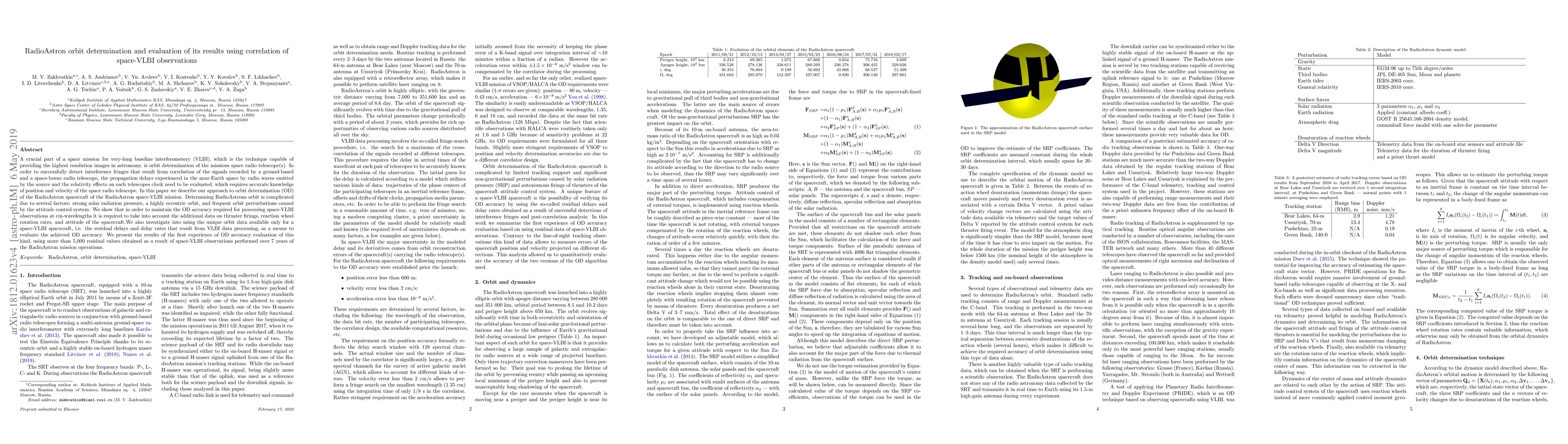 This paper details the orbit determination (OD) approach for the RadioAstron spacecraft, focusing on the complexities introduced by solar radiation pressure, an eccentric orbit, and perturbations from the attitude control system. It evaluates the accuracy of OD by correlating space-VLBI observations and utilizing residual delays and rates from VLBI data processing, presenting results from over 7 years of mission operations.