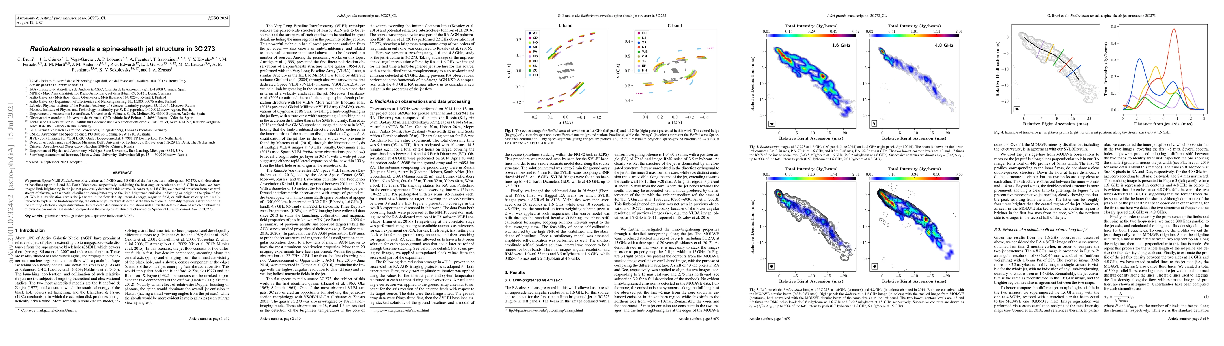The RadioAstron Space-VLBI observations of 3C 273 reveal a spine-sheath jet structure, with limb-brightening at 1.6 GHz indicating a sheath and a central stream at 4.8 GHz suggesting a spine, suggesting a stratification in the emitting electron energy distribution. Future simulations will determine the physical parameters responsible for this structure.
